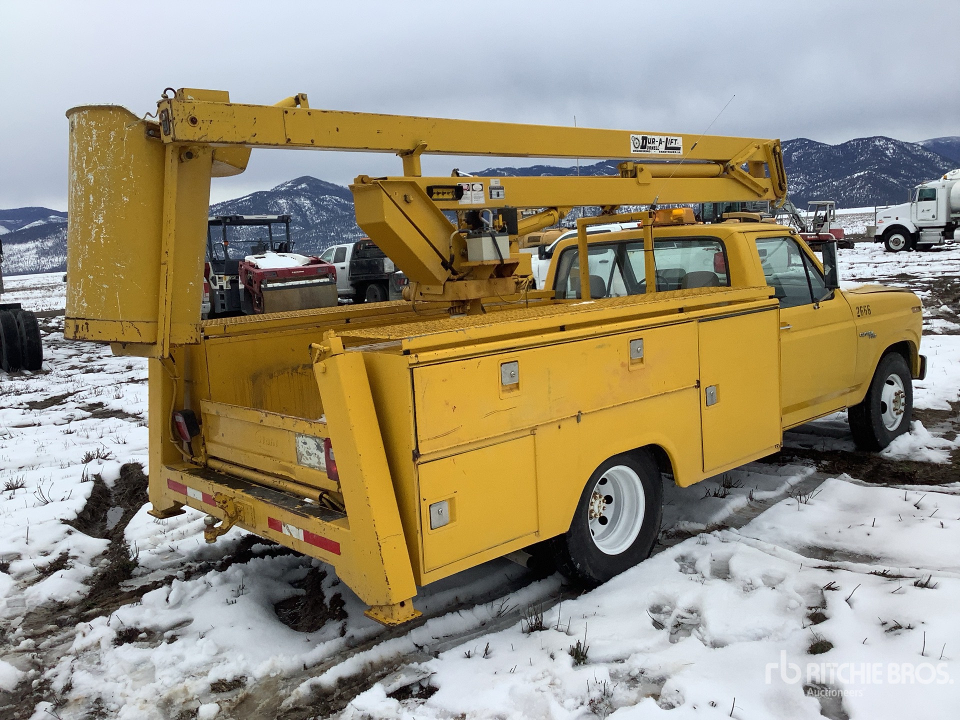 Ford V8 Gasoline Engine, 1317.1 Engine hrs, 4 Automatic Transmission, 10000 lb GVWR, 235/85R16 Front Tires, 235/85R16 Rear Tires, Spring Suspension, 135 in Wheelbase, Hydraulic System, Center Mounted, One-Person Articulated Boom, Utility Body, Straight Down Outriggers, Rear Outriggers, Electric Crane, 9 ft x 90 in Bed, Pintle Hitch
