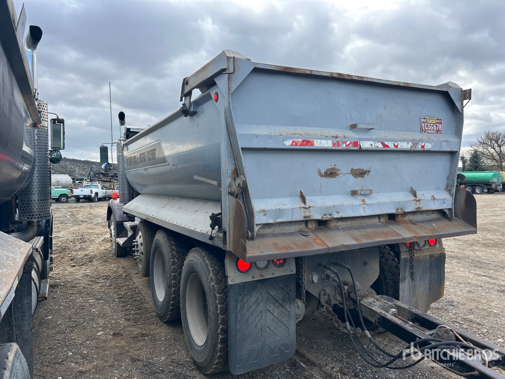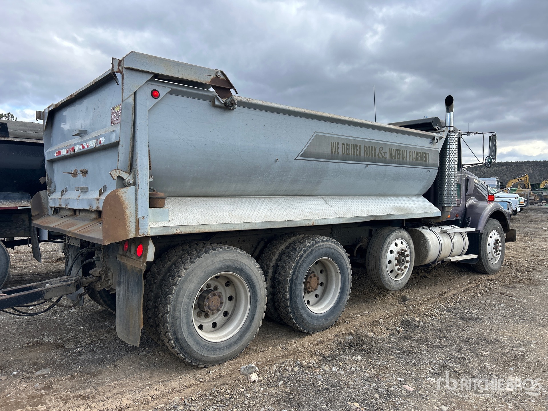 Cat 6 Cylinder Diesel Engine, Engine Brake, Eaton Fuller Manual Transmission, Aluminum Wheels, 11R24.5, Steerable Air Lift Pusher Axle, Rubber over Walking Beam Suspension, 223 in Wheelbase, PTO, 16 ft Long x 4 ft High Steel Body, Electric Roll Tarp, High-Lift Tailgate, Pintle Hitch