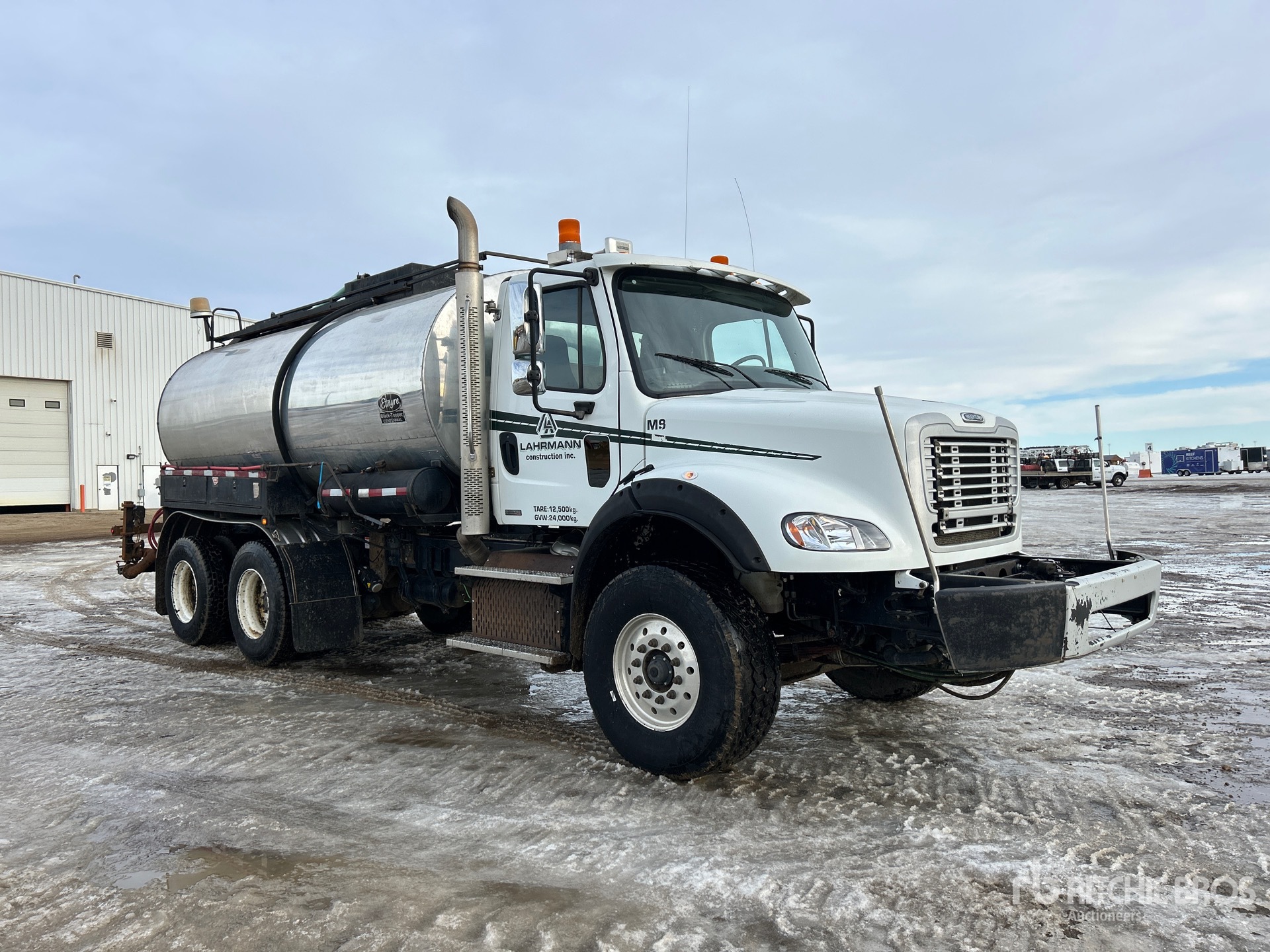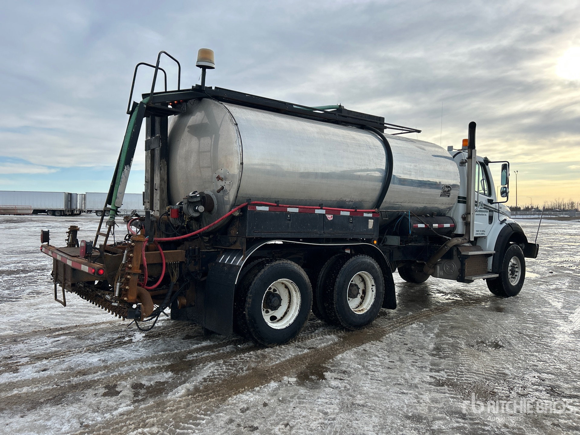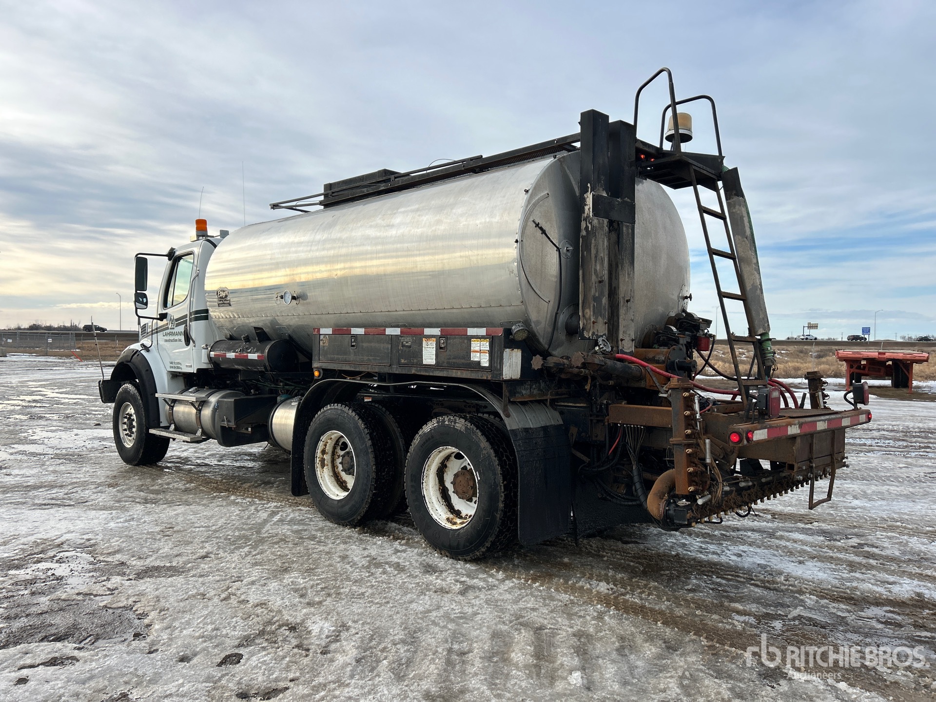 Detroit DD13 6 Cylinder 12.8 L Diesel 450 hp Engine, Requires Diesel Exhaust Fluid, 8840 Engine hrs, Engine Brake, Allison 4000 6-Speed Automatic Transmission, Double Differential Locks, 20000 lb Front Axle, 46000 lb Rears, Meritor RT-46-164P Drive Axles, 6.14:1 Axle Ratio, 66000 lb GVWR, Air Ride Cab, Aluminum Front Wheels, 425/65R22.5 Front Tires, 11R22.5 Rear Tires, Dual Steering Boxes, Double Frame, TufTrac Suspension, 210 in Wheelbase, 12 ft Folding Spray Bar, Double Flue w/ Diesel Burners, In-Cab Controls, Manual Bar Controls, Hydraulic Driven Pump, Live Hydraulics , Complete-Dispersal-for-Lahrmann-Construction-Inc