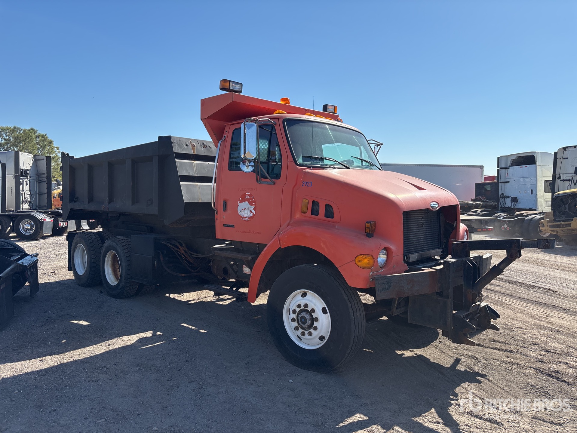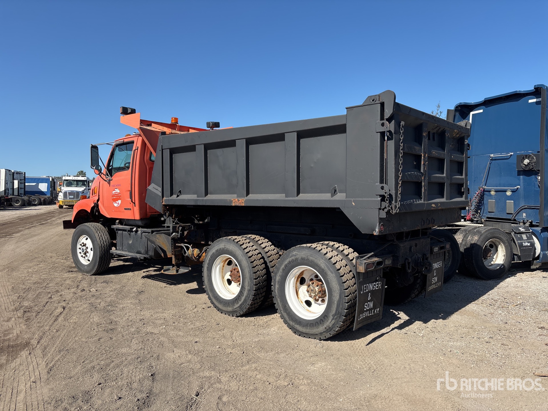 Cat 3126 6 Cylinder 7.2 L Diesel Engine, Automatic Transmission, 16000 lb Front Axle, 40000 lb Rears, 56000 lb GVWR, 315/80R22.5 Front Tires, 11R22.5 Rear Tires, Double Frame, Hendrickson Spring over Walking Beam Suspension, 196 in Wheelbase, PTO, Steel Spreader, 1 Spinners, In-Cab Controls, 14 ft Long x 3 ft 5 in High Steel Body, 2-Way Dump, Pintle Hitch