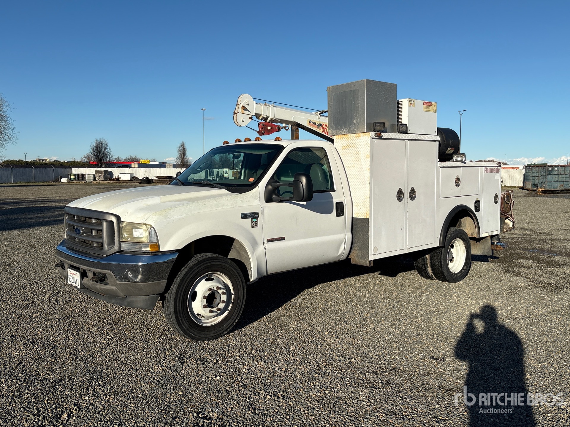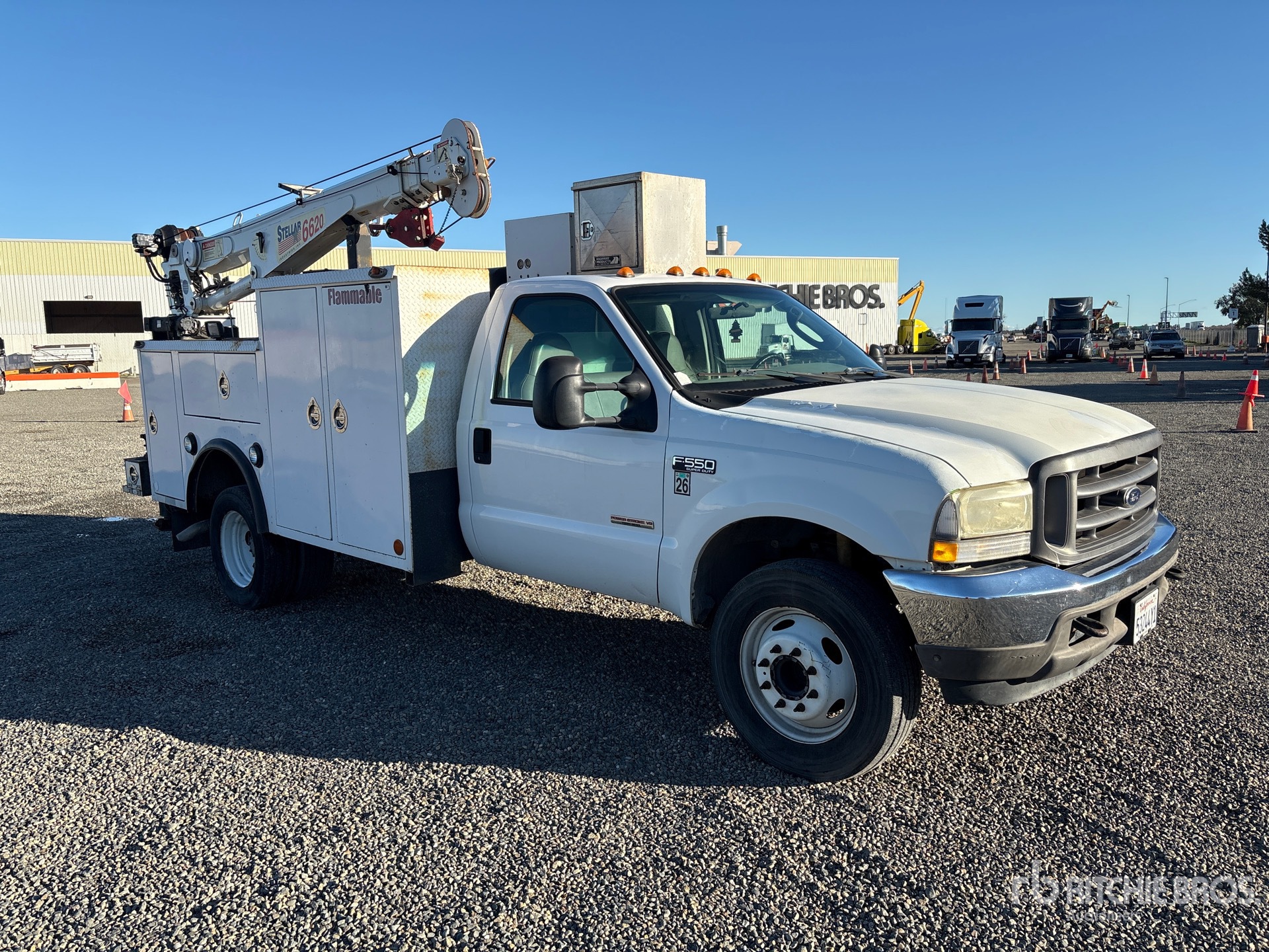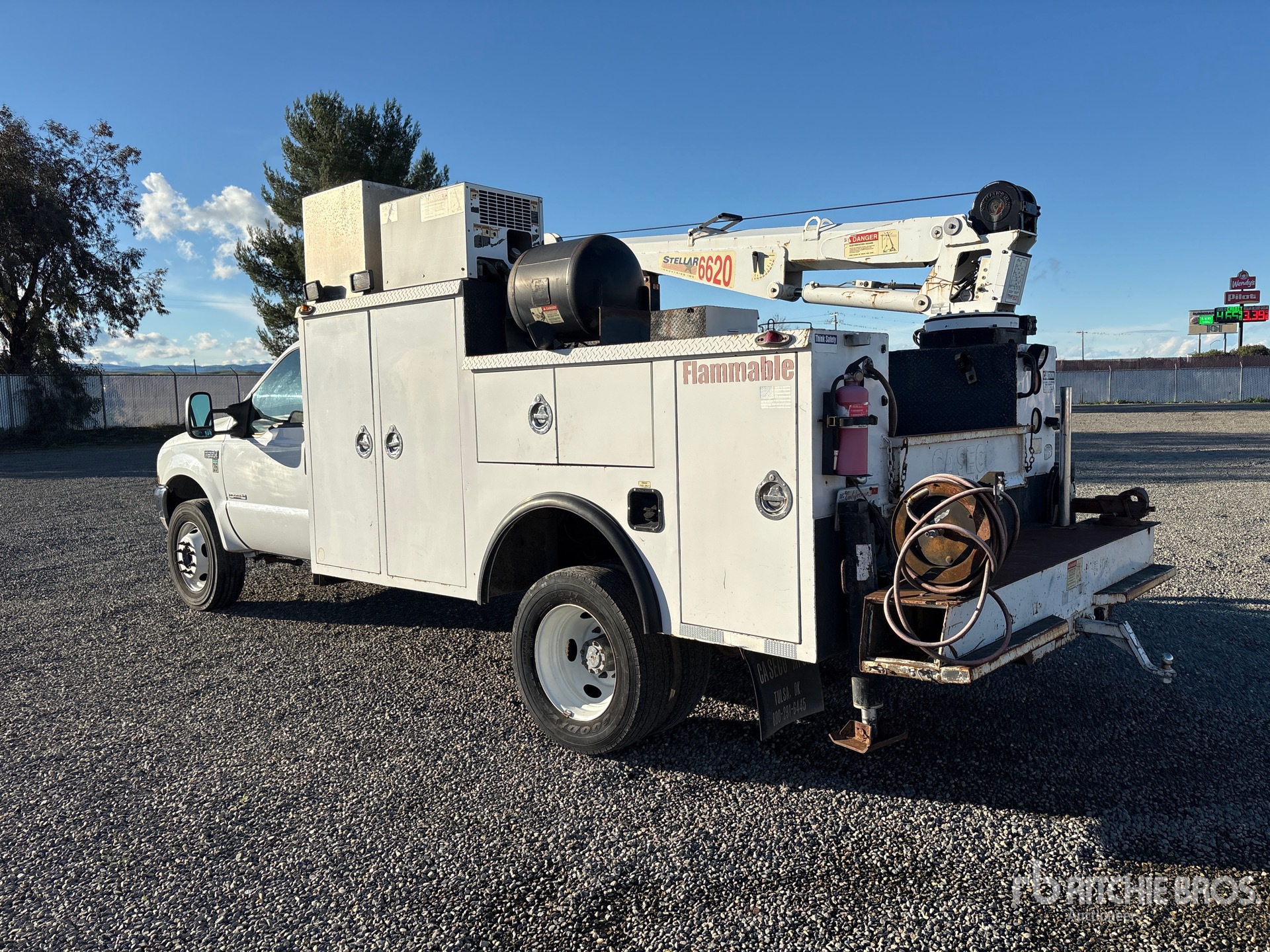 V8 6 L Diesel Engine, 5-Speed Manual Transmission, 6000 lb Front Axle, 13500 lb Rears, 17500 lb GVWR, 245/70R19.5, Spring Suspension, 156 in Wheelbase, PTO, Caseco MM238 11 ft Body, Hydraulic Stabilizers, Stellar 6620 6000 lb 3 Section Hydraulic Crane, Wired Remote Control, Stellar SRS-40 PTO Air Compressor, Air Hose Reel