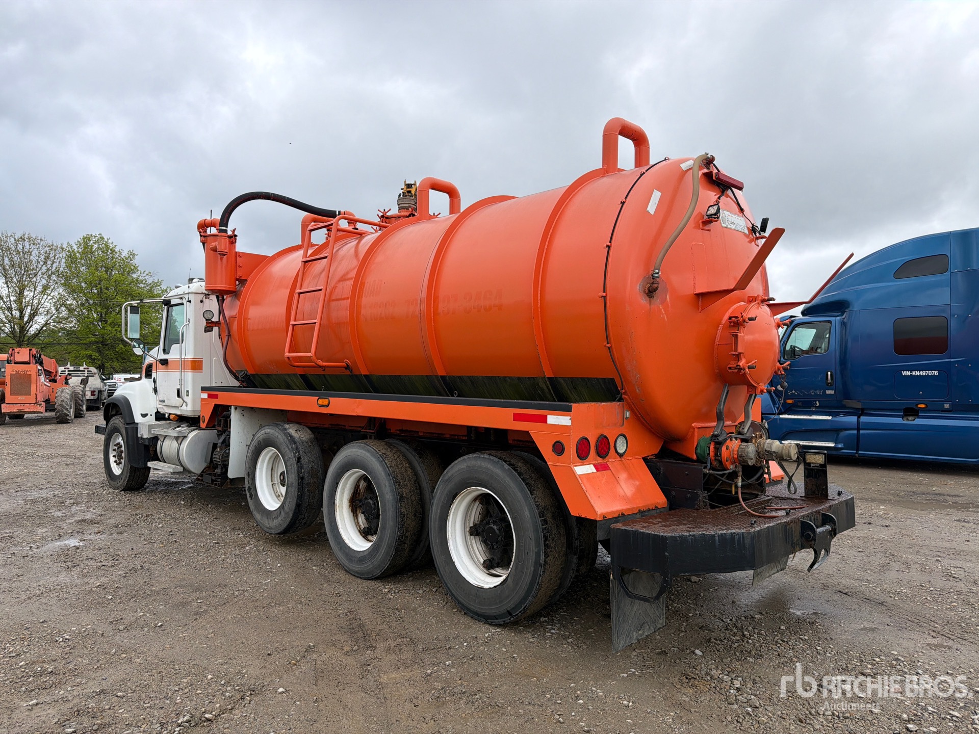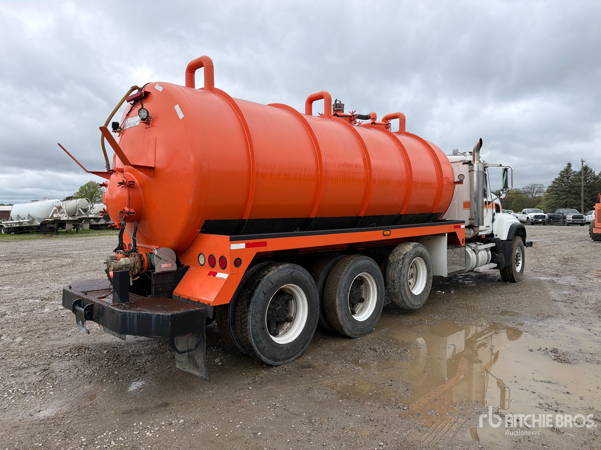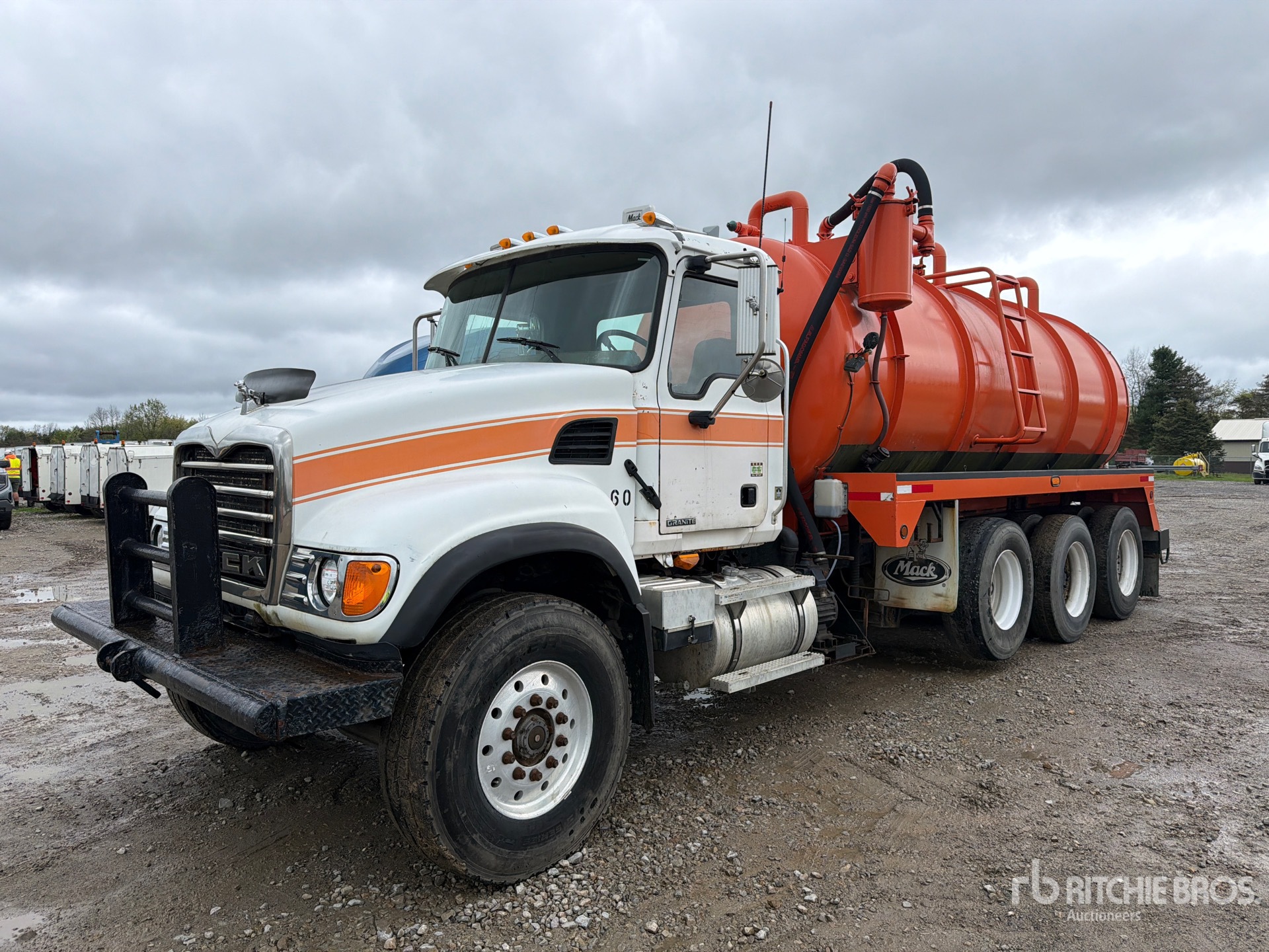 Mack 6 Cylinder Diesel Engine, 31411.1 Engine hrs, Exhaust Brake, Mack Maxitorque es 8LL Manual Transmission, Differential Lock, 18000 lb Front Axle, 62000 lb Rears, 80000 lb GVWR, Air Ride Cab, Air Lift Pusher Axle, Air Lift Tag Axle, Double Frame, Camelback Spring Suspension, 260 in Wheelbase, PTO, Steel Debris Tank, 5 in Suction Hose, PTO Driven Pump