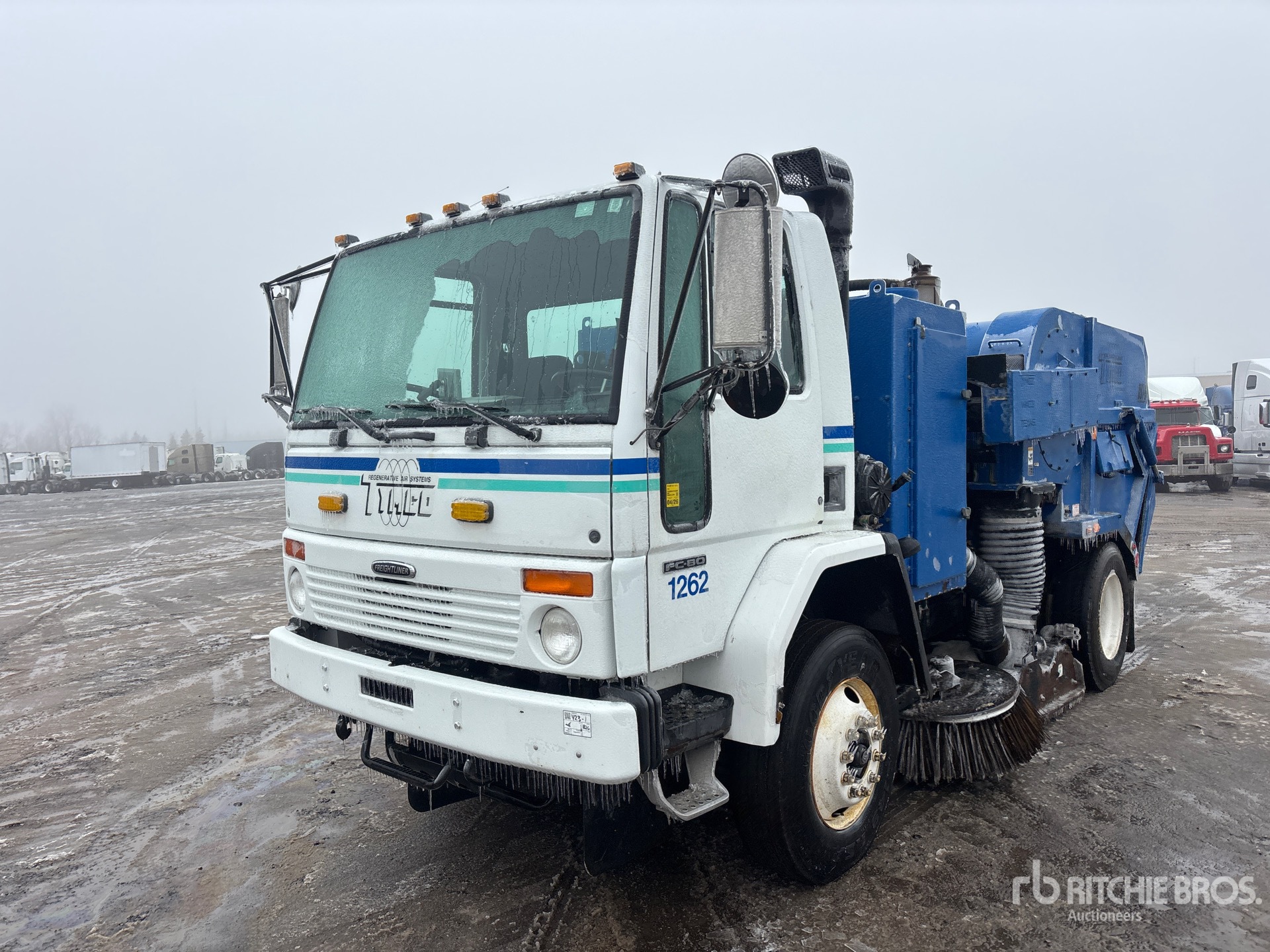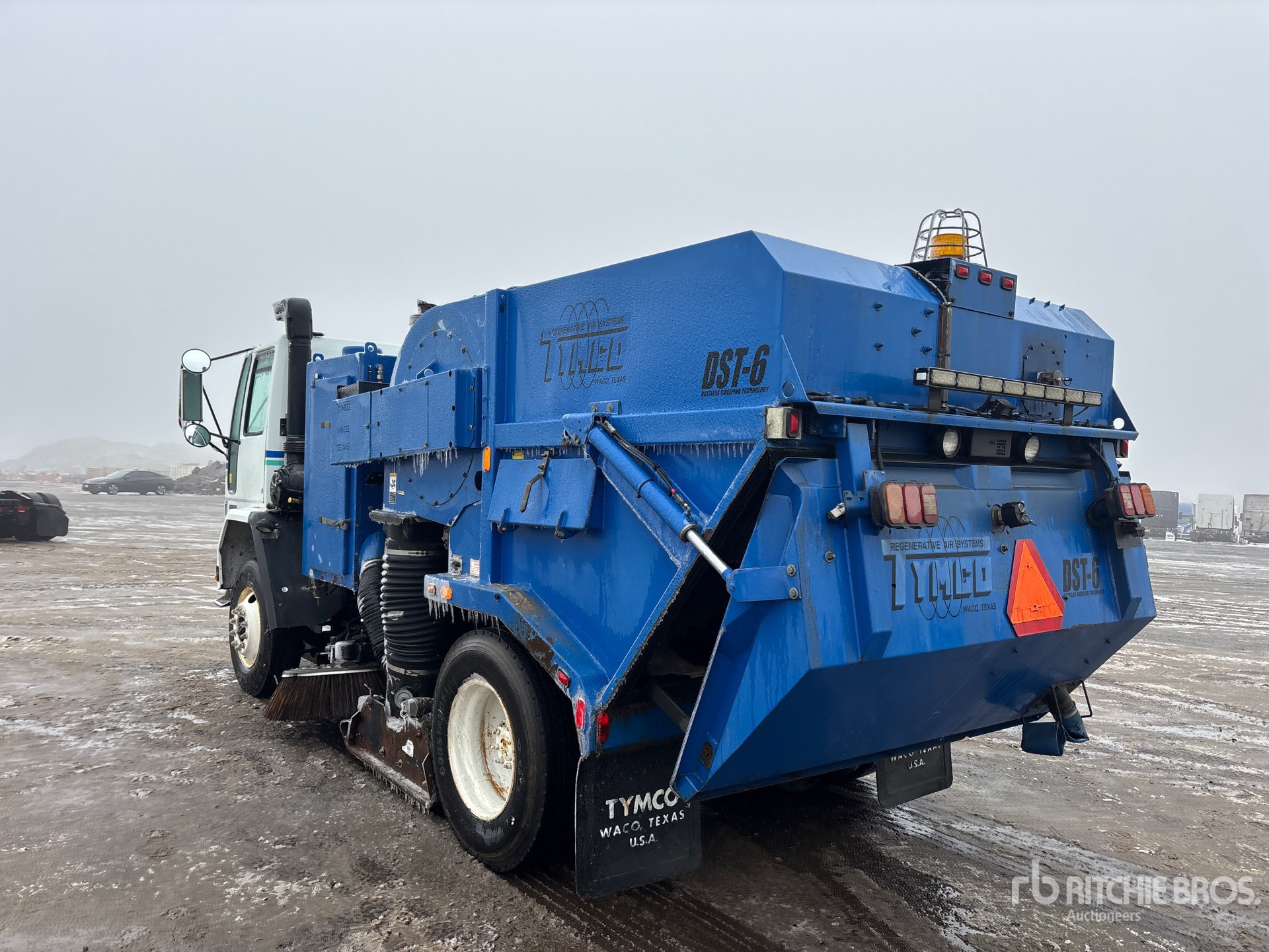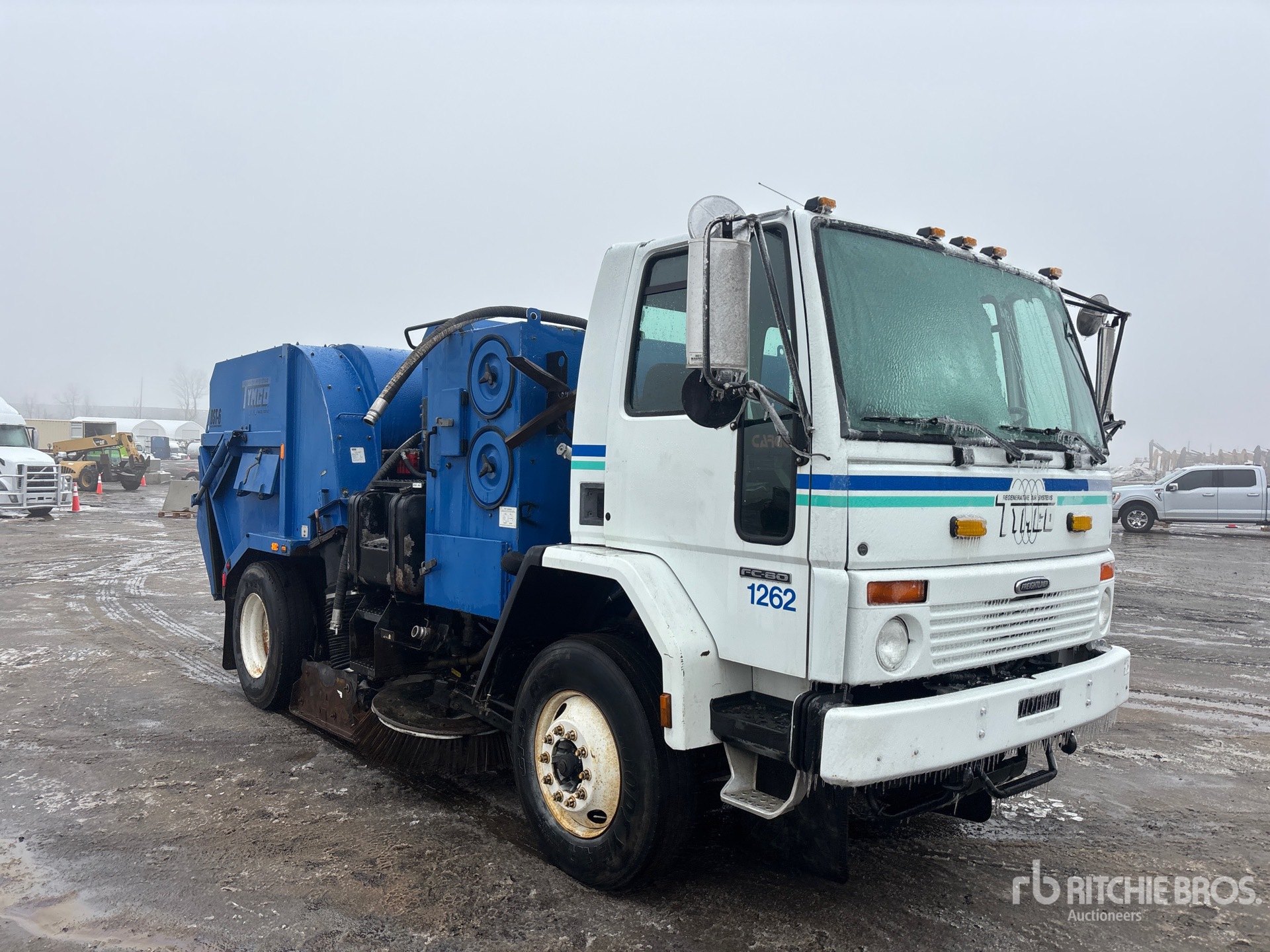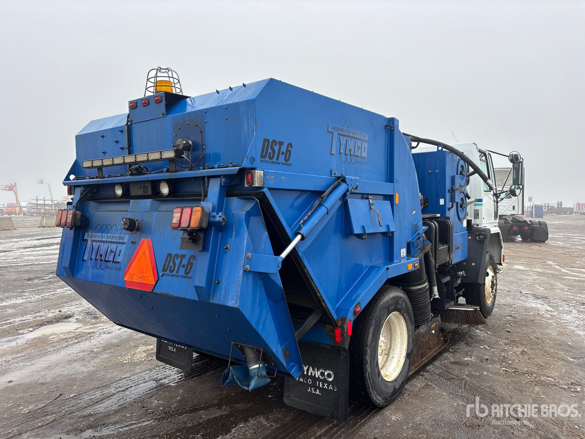 Cummins ISB 6 Cylinder 5.9 L Diesel 200 hp Engine, 2006 US EPA Label, CARB Compliant, Automatic Transmission, 12000 lb Front Axle, 21000 lb Rears, 33000 lb GVWR, 11R22.5, Spring Suspension, 148 in Wheelbase, PTO, Auxiliary Engine, Vacuum Sweeper, 90 in Under Body Broom, Gutter Brooms, Material Elevator, Hydraulic Dump