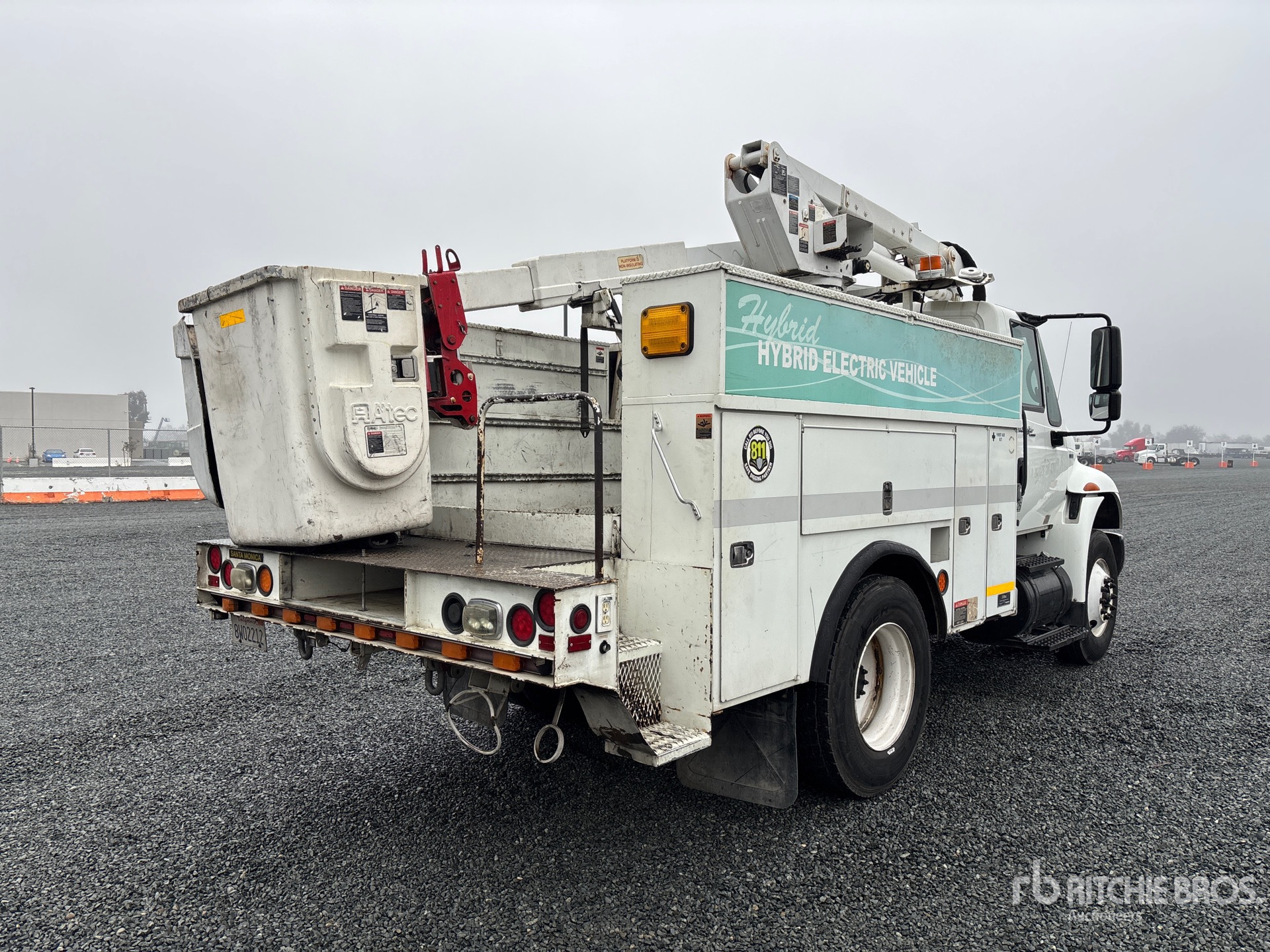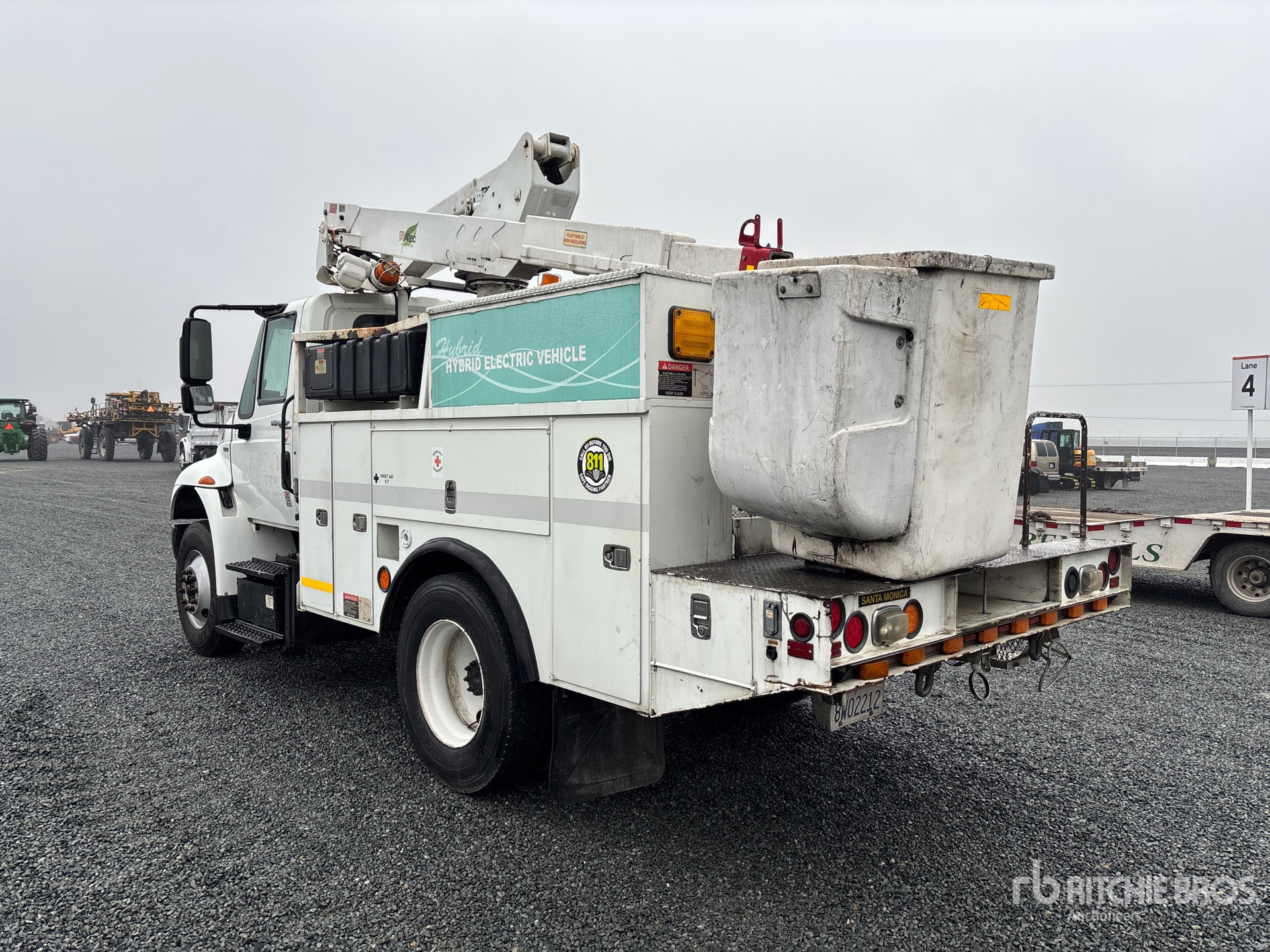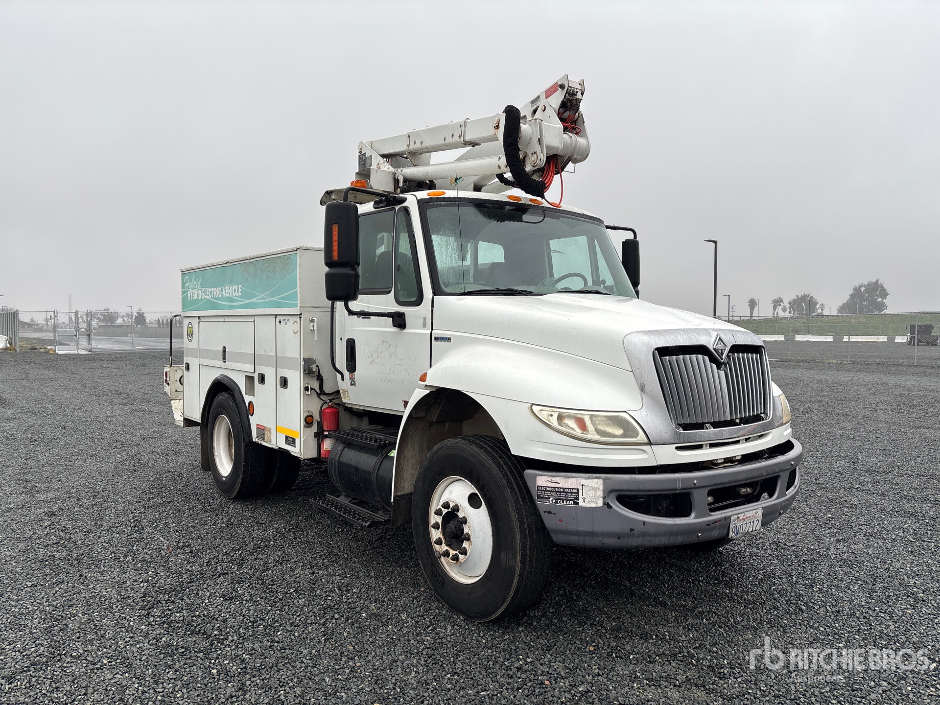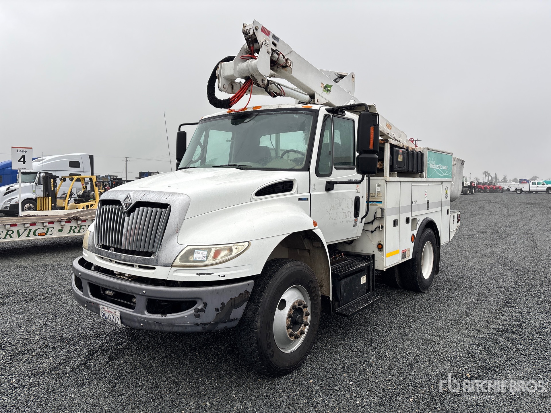 Located in Lane 13 Spot 21, International MaxxForce DT 6 Cylinder 7.6 L Diesel 245 hp Engine, 2009 US EPA Label, 9046 Engine hrs, Eaton Fuller Automatic Transmission, 12000 lb Front Axle, 17500 lb Rears, 25999 lb GVWR, 11R22.5, Spring Suspension, 144 in Wheelbase, PTO, 350 lb Capacity, Center Mounted, One-Person Articulating-Telescopic Boom, Utility Body, 13 ft x 96 in Bed