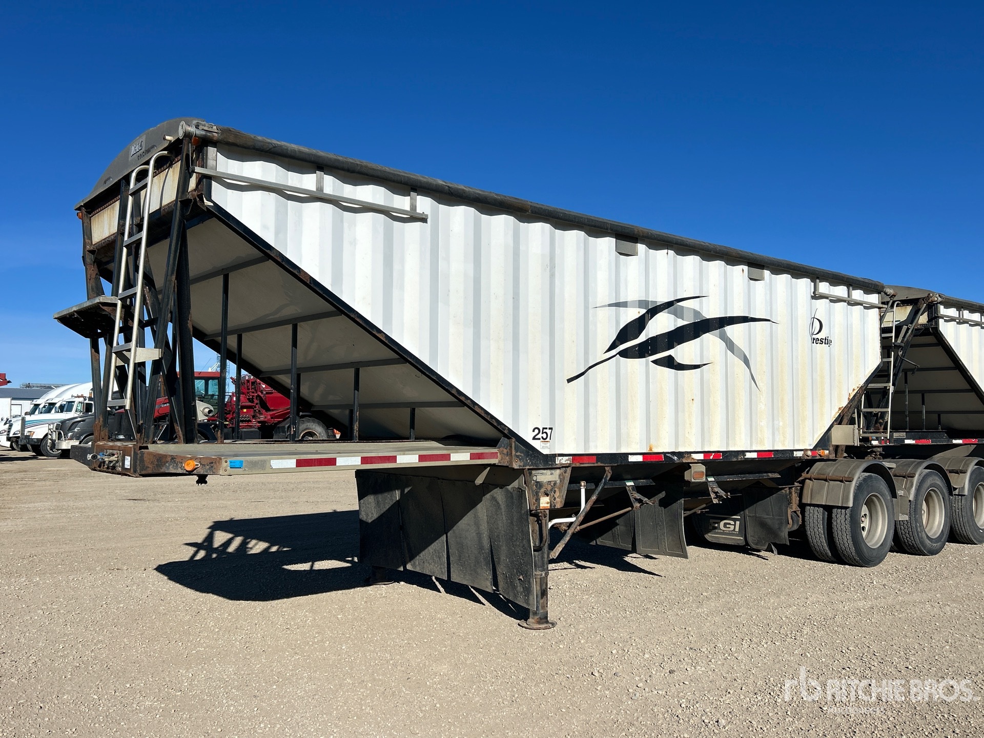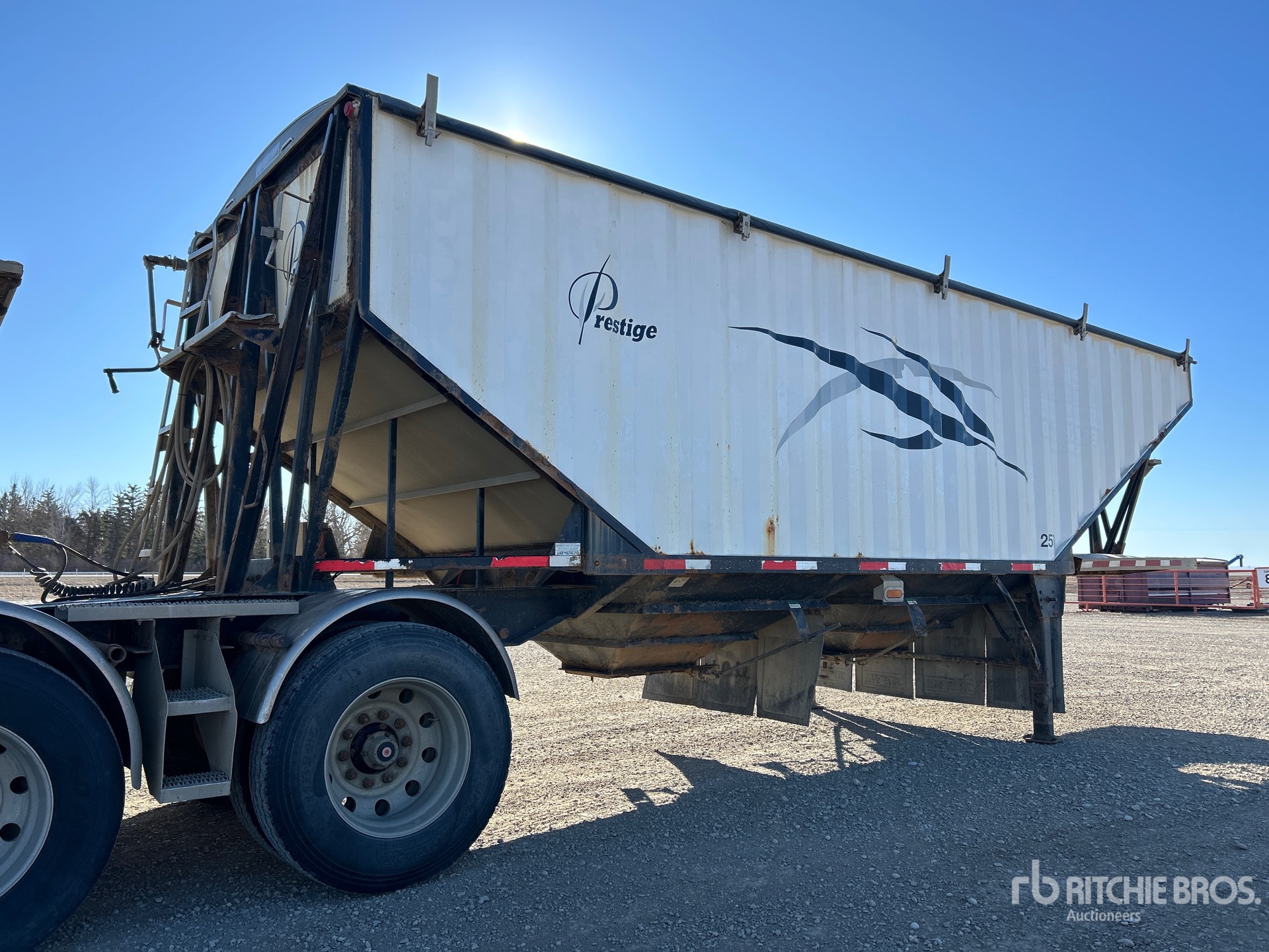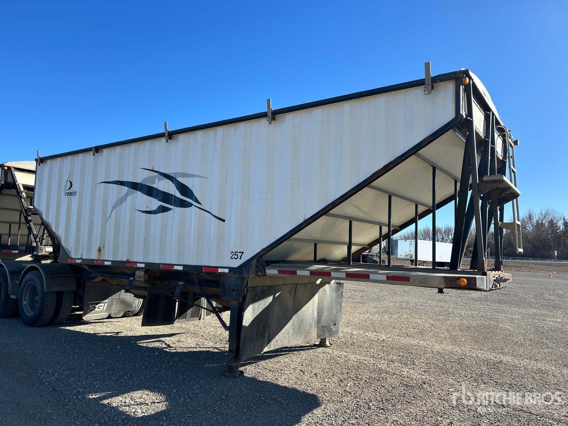 Air Ride Suspension, 2 Hoppers, 28 ft Steel Sides & Aluminum Slopes Box, 75 in, Side Walls, Open Ended, Manual Roll Tarp, Air Scales, Aluminum Outer Wheels, 11R24.5 Tires, 38000 kg GVWR