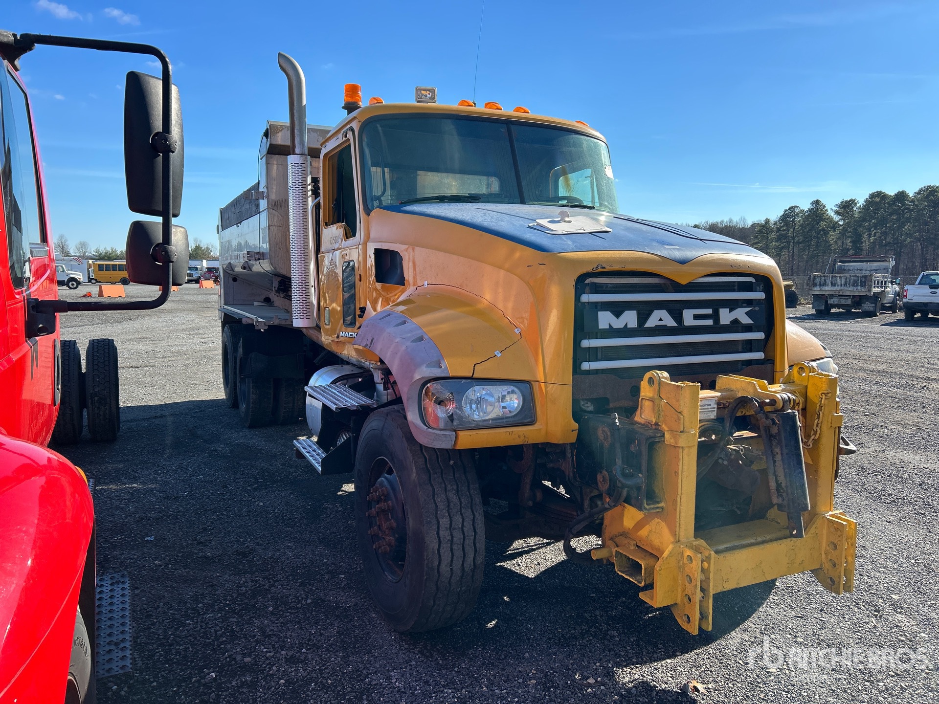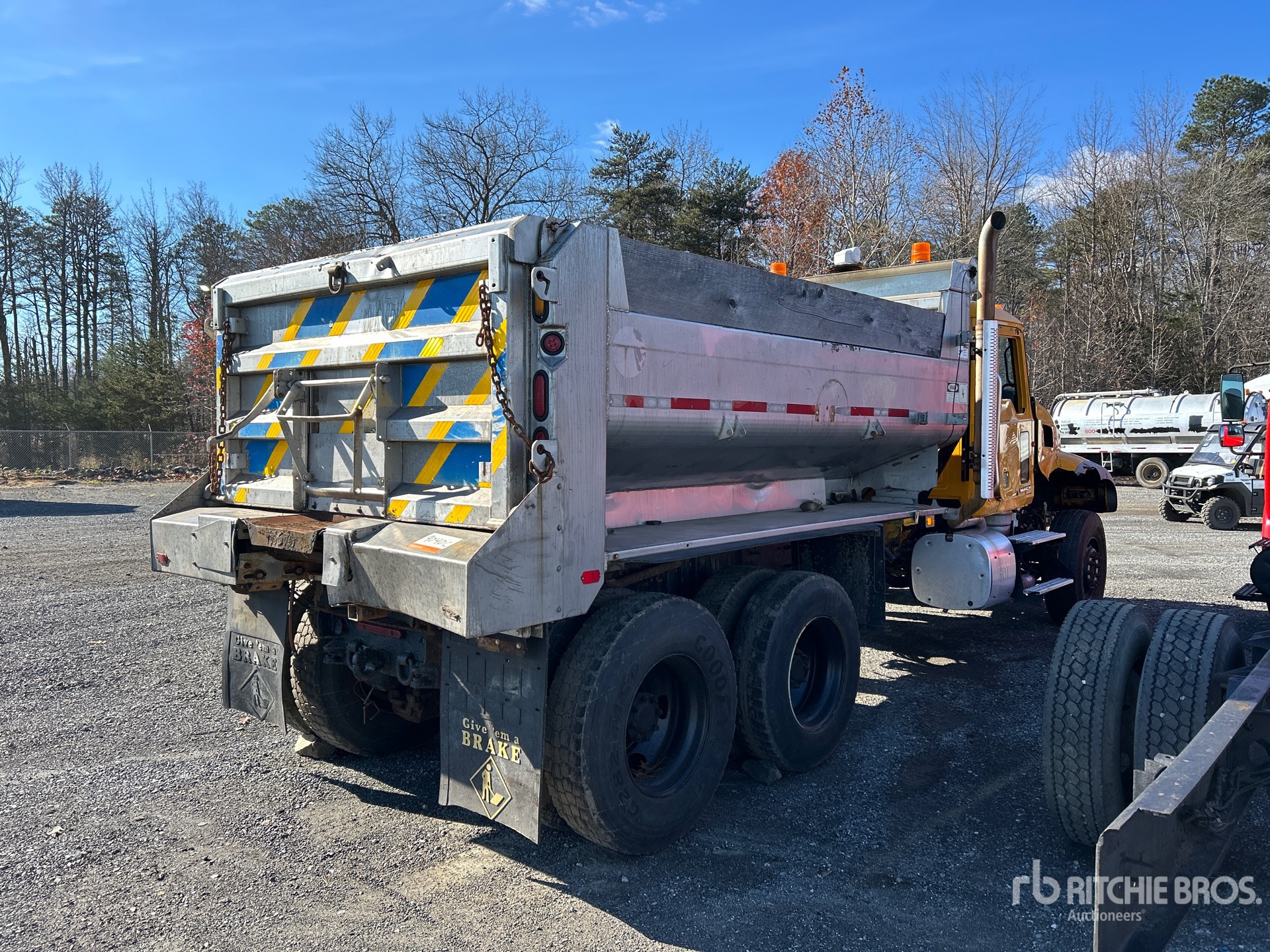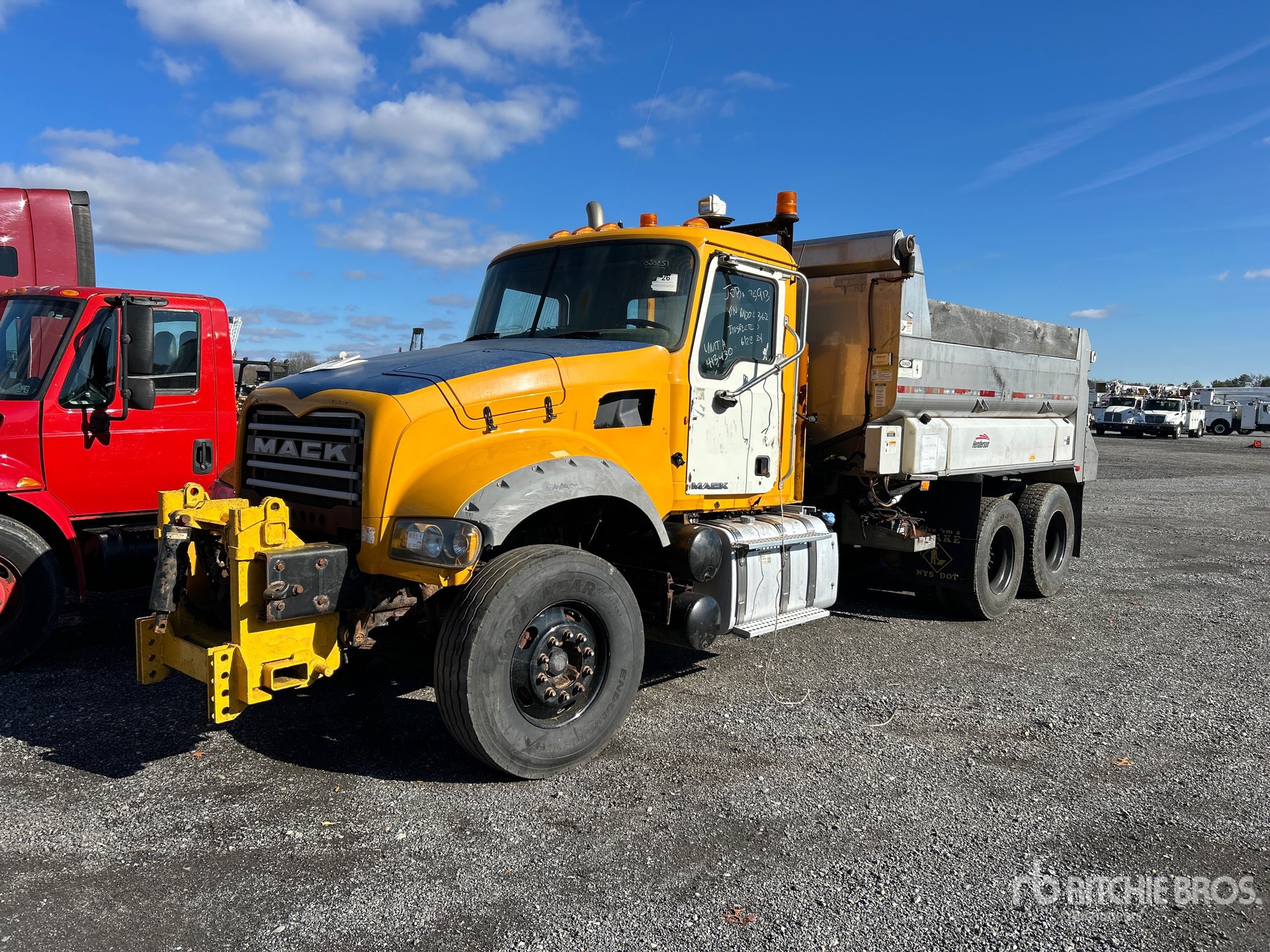 Located in Lane 43 Spot 47, Mack MP7 6 Cylinder Diesel Engine, 2011 US EPA Label, Eaton Fuller Manual Transmission, 20000 lb Front Axle, 46000 lb Rears, 66000 lb GVWR, 315/80R22.5 Front Tires, 11R22.5 Rear Tires, Spring Suspension, 228 in Wheelbase, Henderson x 1 ft 10 in High Aluminium Body, Tailgate Chute