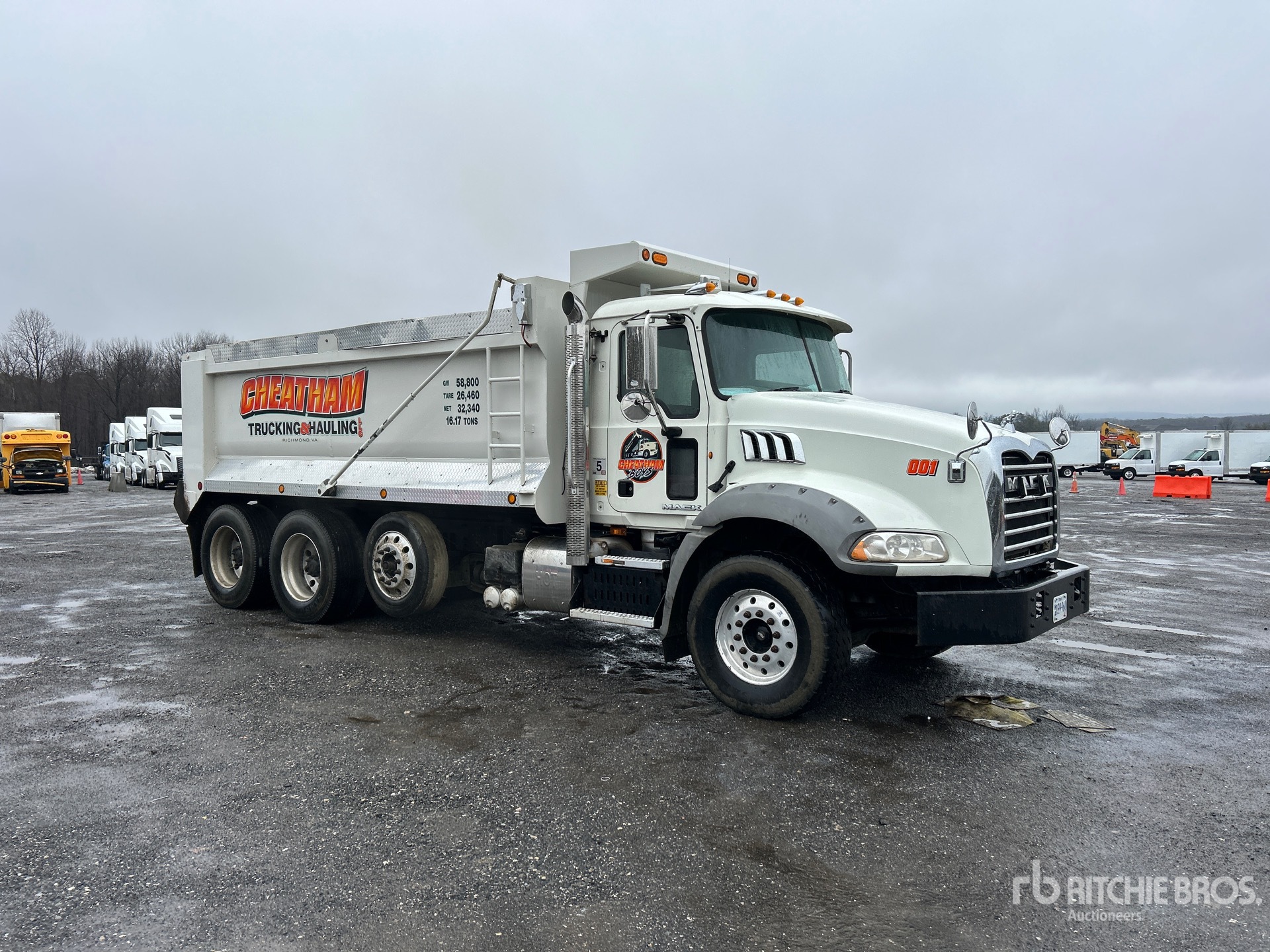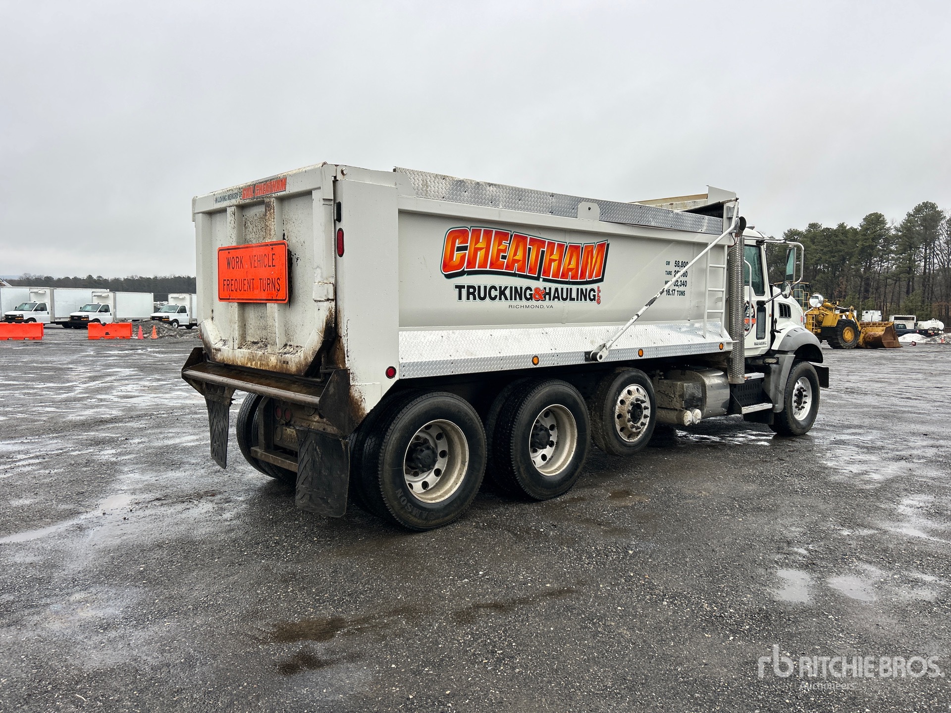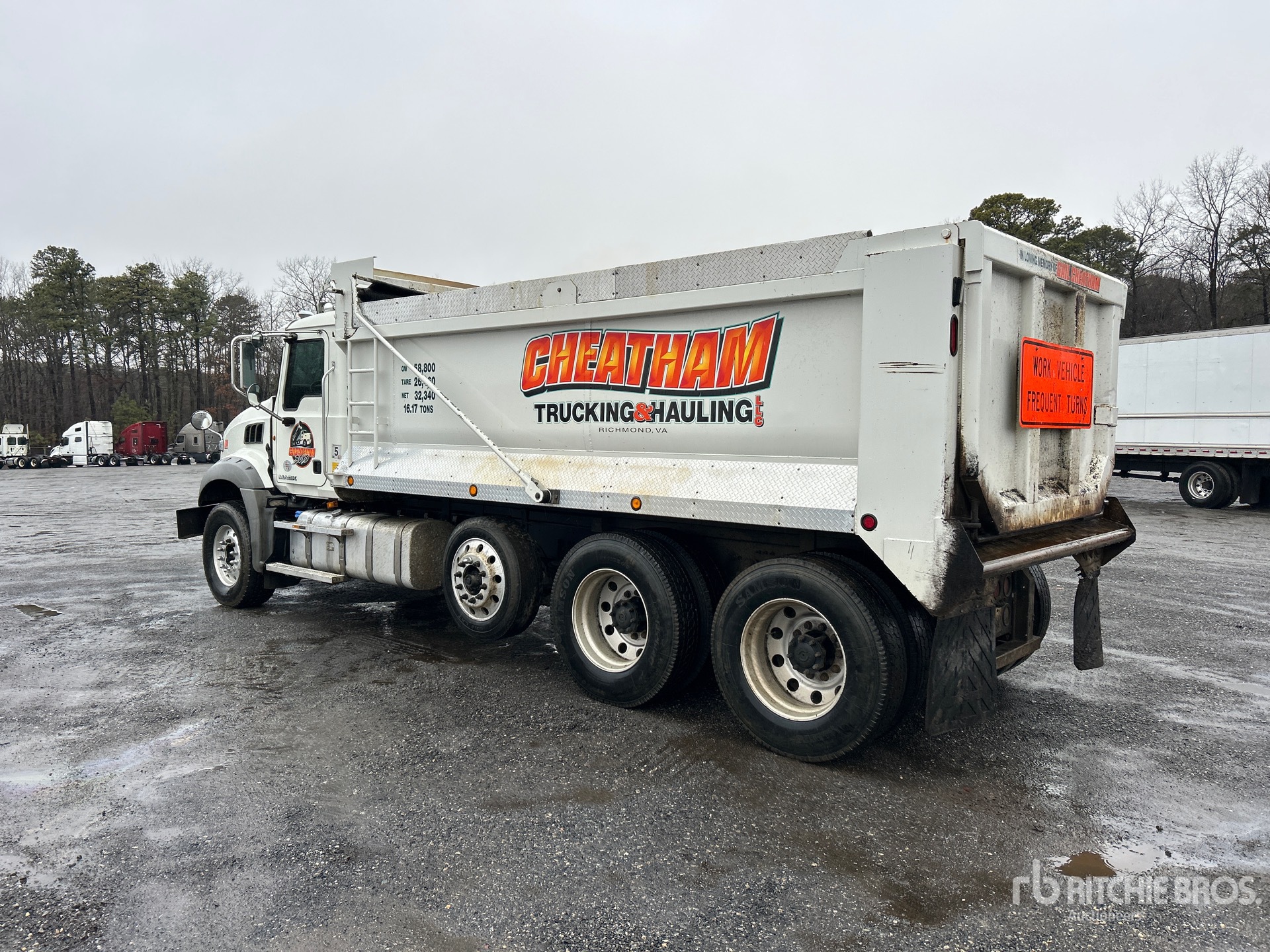 Mack 6 Cylinder Diesel Engine, 2012 US EPA Label, 13545 Engine hrs, Allison Automated Transmission, 20000 lb Front Axle, 40000 lb Rears, 60000 lb GVWR, Aluminum Wheels, 385/65R22.5 Front Tires, 11R24.5 Rear Tires, Air Lift Pusher Axle, Air Lift Tag Axle, Air Ride Suspension, 223 in Wheelbase, PTO, 17 ft Long x 4 ft High Steel Body, Round Bottom