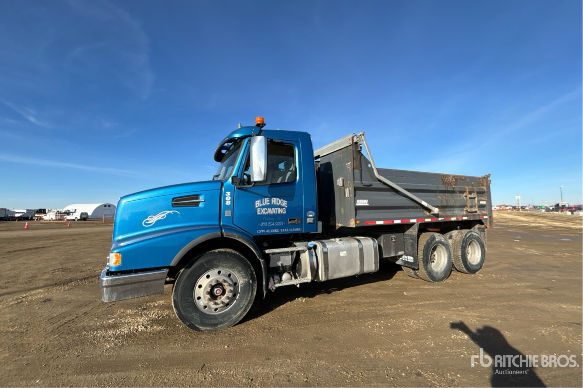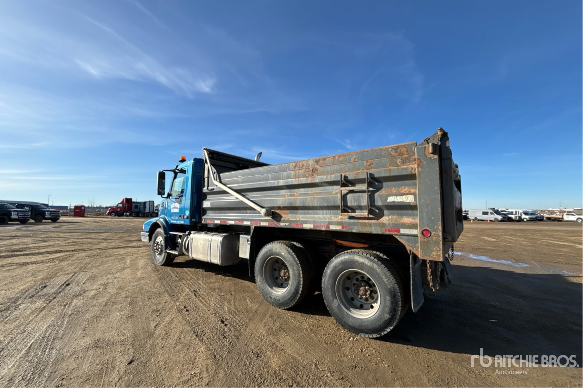 Volvo D13H500 6 Cylinder 12.8 L Diesel 500 hp Engine, 2013 US EPA Label, CARB Compliant, Requires Diesel Exhaust Fluid, 7278 Engine hrs, Engine Brake, Volvo ATO2612D 12-Speed Automatic Transmission, Differential Lock, 14600 lb Front Axle, 46000 lb Rears, Meritor RT-46-160 Drive Axles, 3.58:1 Axle Ratio, 60600 lb GVWR, Aluminum Wheels, 315/80R22.5 Front Tires, 11R22.5 Rear Tires, Spring Suspension, 204 in Wheelbase, PTO, Renn 15 ft Long x 3 ft 4 in High Steel Body, Electric Roll Tarp, 2-Way Tailgate, Rear Hydraulics, Pintle Hitch