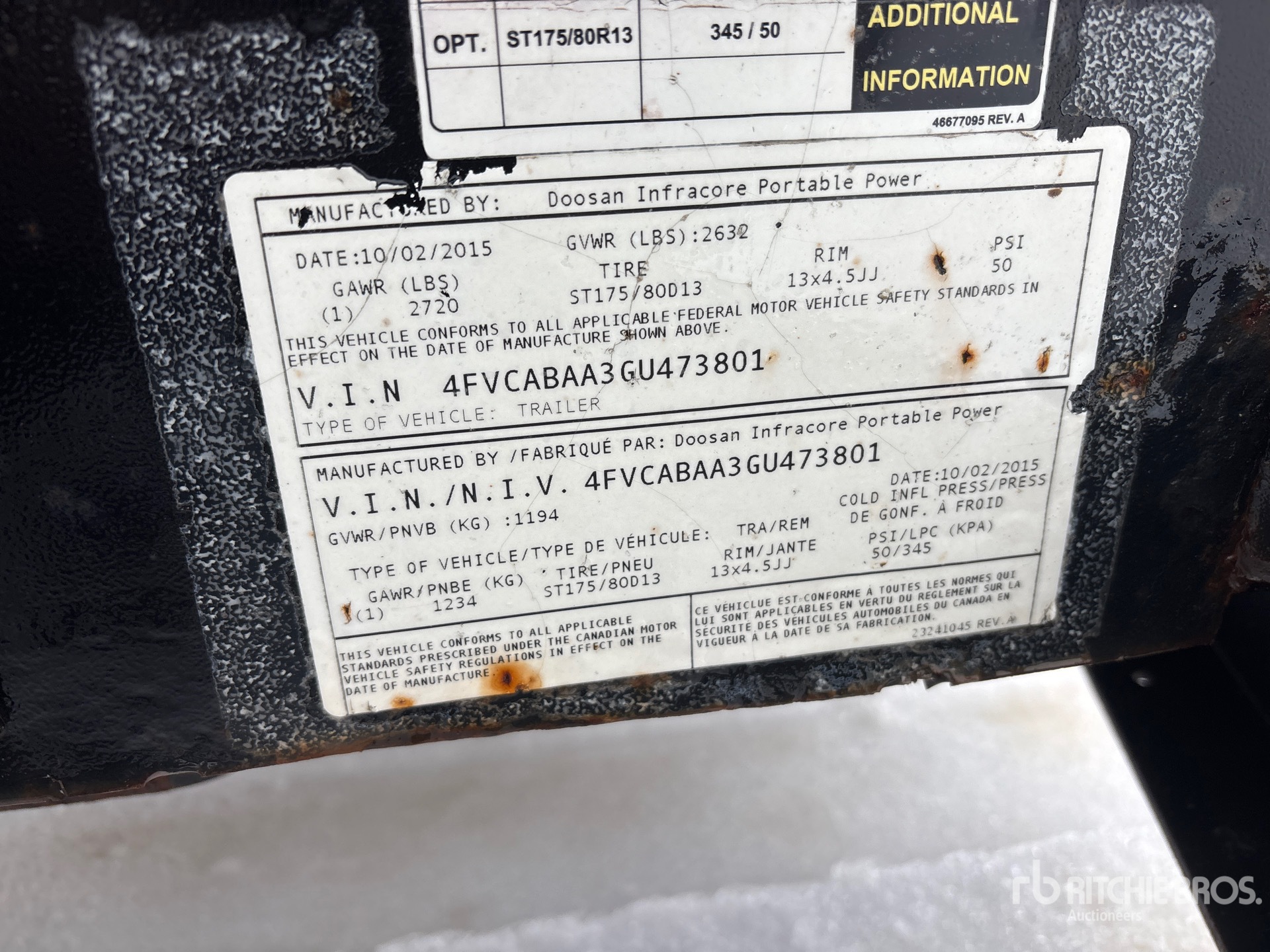 2015 US EPA Label, Kubota V2403-M-DI-ET04 4 Cylinder 36.5 kW 2.4 L Diesel Engine, Lunette Ring Carrier Trailer