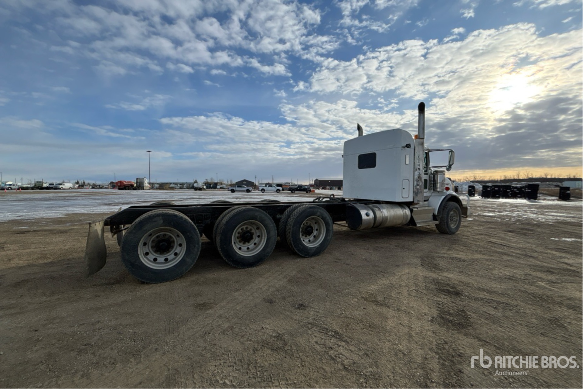 Cummins 6 Cylinder 15.0 L Diesel Engine, Requires Diesel Exhaust Fluid, 21095 Engine hrs, Engine Brake, Eaton Fuller RTLO-20918B 18-Speed Manual Transmission, Triple Differential Locks, 20000 lb Front Axle, 57000 lb Rears, Meritor RZ-XX-166PWT Drive Axles, 4.30:1 Axle Ratio, 77000 lb GVWR, Air Ride Cab, 36 in Flat Top Sleeper Cab, Aluminum Wheels, 385/65R22.5 Front Tires, 11R24.5 Rear Tires, Dual Steering Boxes, Hendrickson Air Ride Suspension, 268 in Wheelbase, 166 in Cab to Axle, 256 in Cab to End of Frame