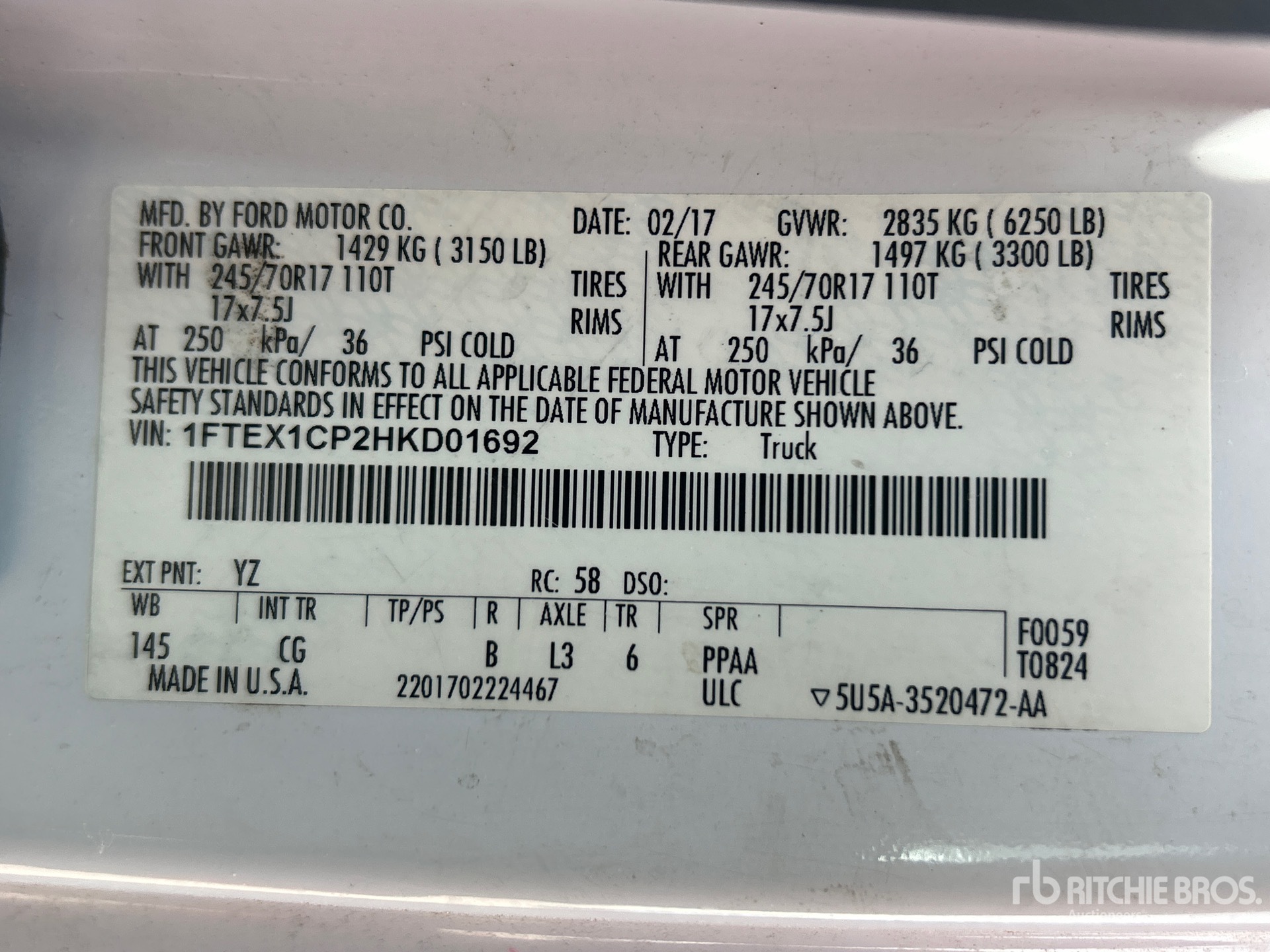 2.7 L V6 Gasoline Engine, 2017 US EPA Label, Automatic Transmission, Air Conditioner, Power Windows, Tonneau Cover, Weather Guard Tool Box, Spray-On Bed Liner, 6250 lb GVWR, 245/70R17 Tires, 6 ft 7 in Bed