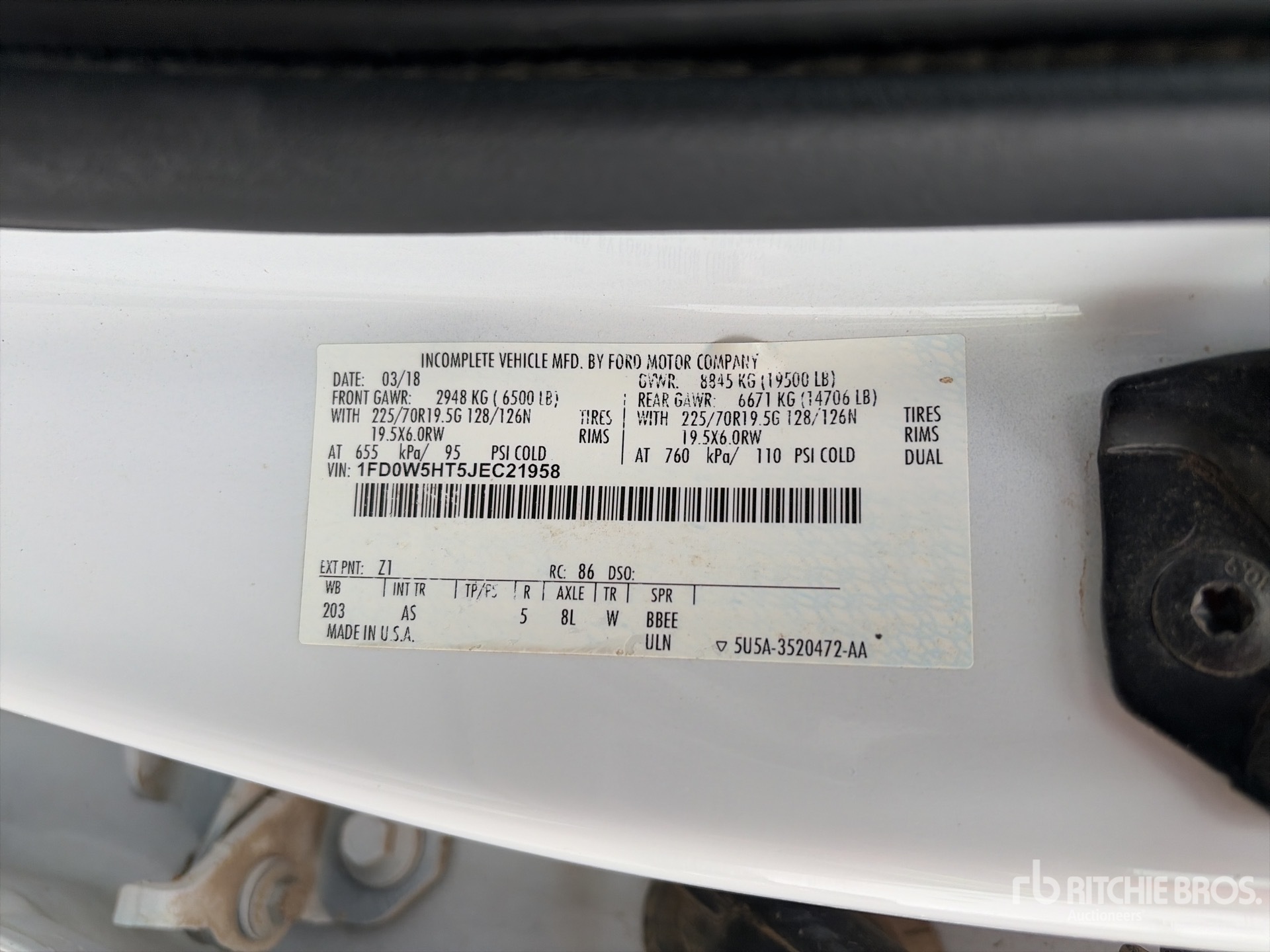 Ford Motors V8 6.7 L Diesel Engine, 2018 US EPA Label, Requires Diesel Exhaust Fluid, 5087 Engine hrs, Automatic Transmission, 6500 lb Front Axle, 14706 lb Rears, 19500 lb GVWR, 225/70R19.5, Spring Suspension, 203 in Wheelbase, 12 ft 6 in x 96 in Bed
