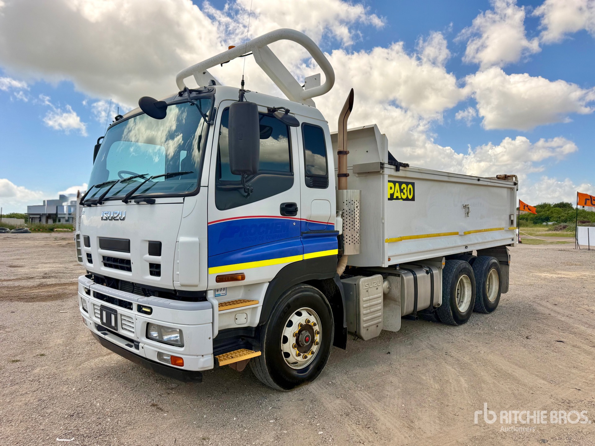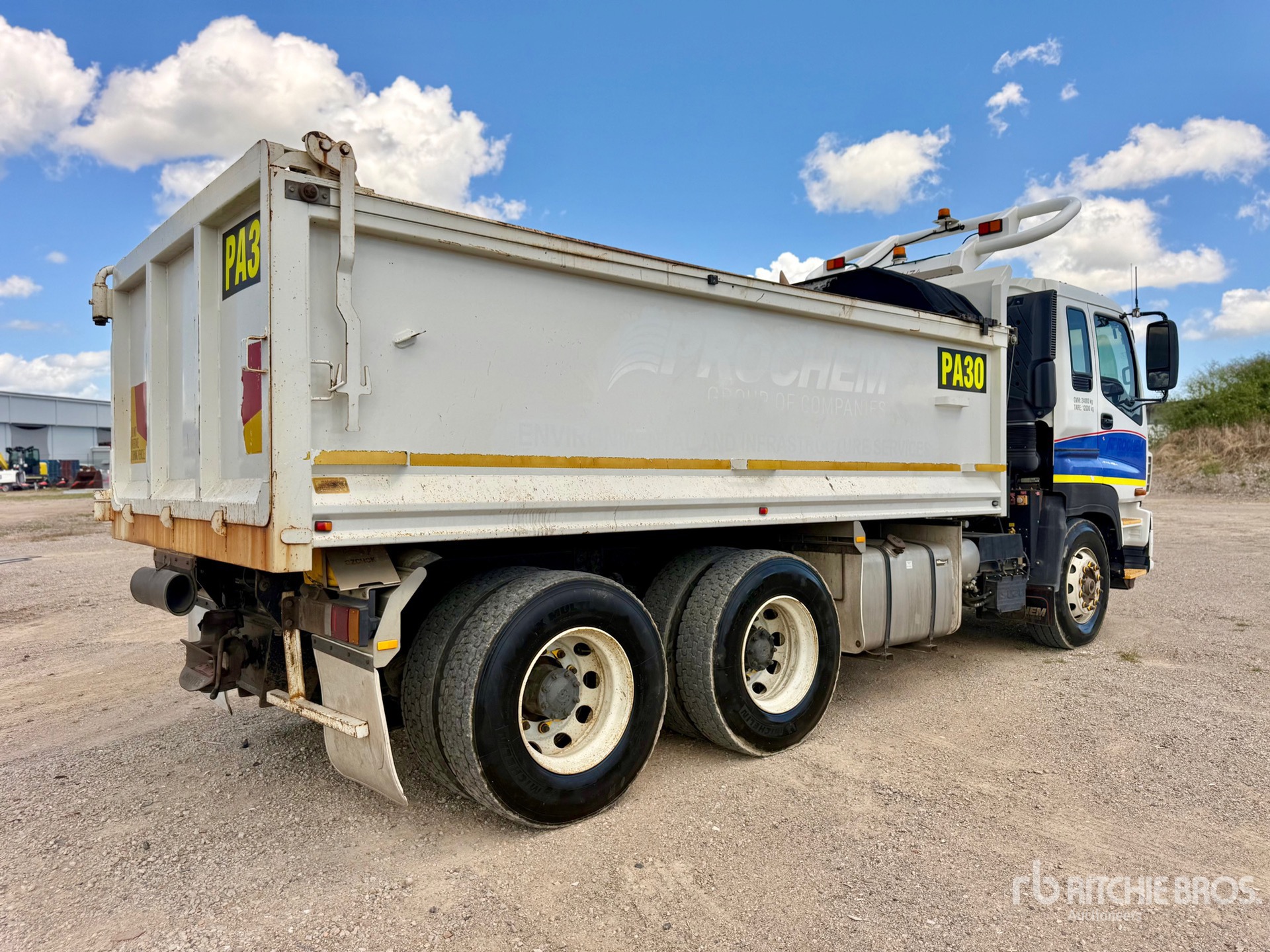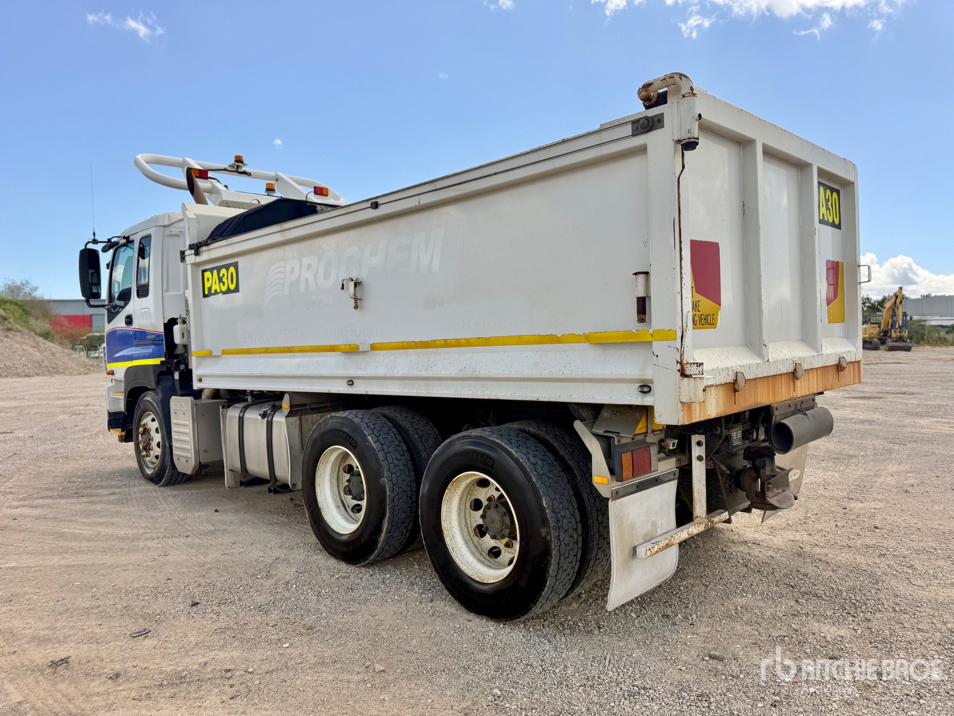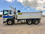 6 Cylinder Diesel 450 hp Engine, Exhaust Brake, Automatic Transmission, 295/80R22.5 Front Tires, 11R22.5 Rear Tires, 6-Rod Suspension, 4300 mm Wheelbase, PTO, 4700 mm Long x 1100 mm High Steel Body, Auto Lube System, Manual Roll Tarp, 2-Way Tailgate, Ringfeder, GVM 24 t, ROPS
