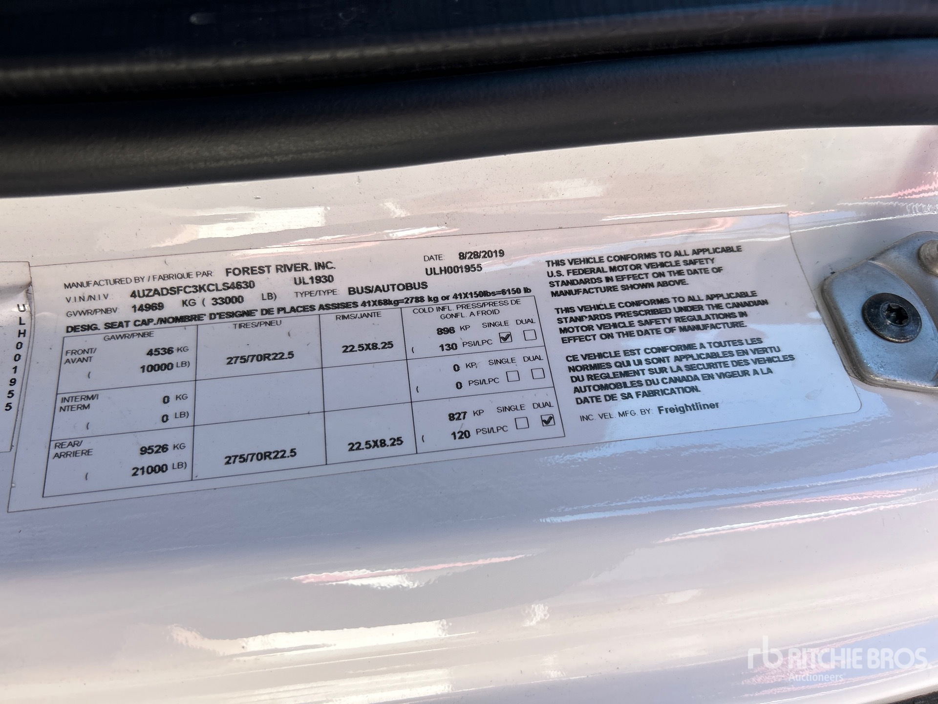 Air Conditioner, Automatic Transmission, 4653 hrs Carrier Engine, Cummins B6.7300 6 Cylinder 6.7 L Diesel 300 hp Engine, 2019 US EPA Label, Requires Diesel Exhaust Fluid, Aluminum Outer Wheels, 275/70R22.5, Air Ride Suspension, 320 in Wheelbase