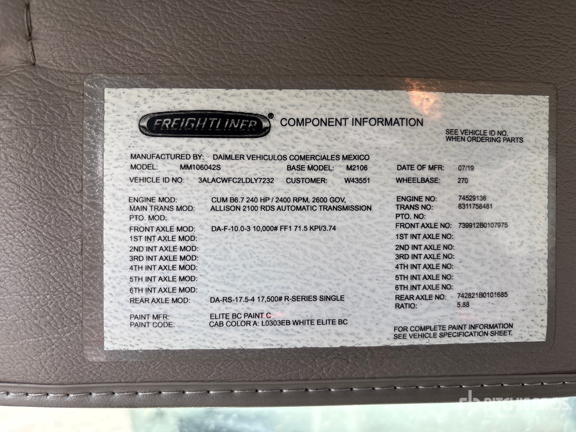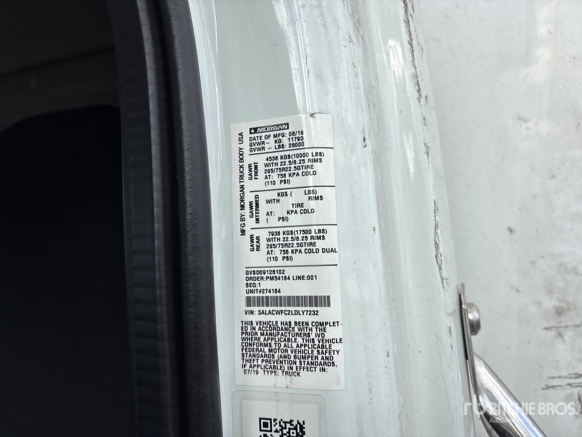 Diesel 240 kW Engine, 2019 US EPA Label, Requires Diesel Exhaust Fluid, 9562 Engine hrs, Allison 2100 Transmission, 10000 lb Front Axle, 17500 lb Rears, 26000 lb GVWR, 295/75R22.5, Airliner Air Ride Suspension, 270 in Wheelbase, 26 ft x 102 in Wide x 92 in High Body, Liftgate