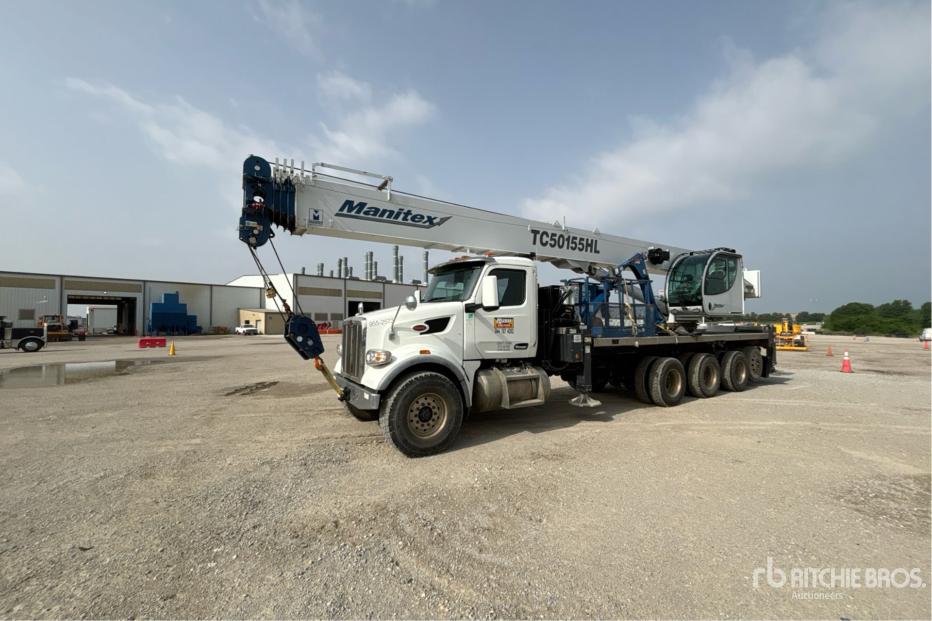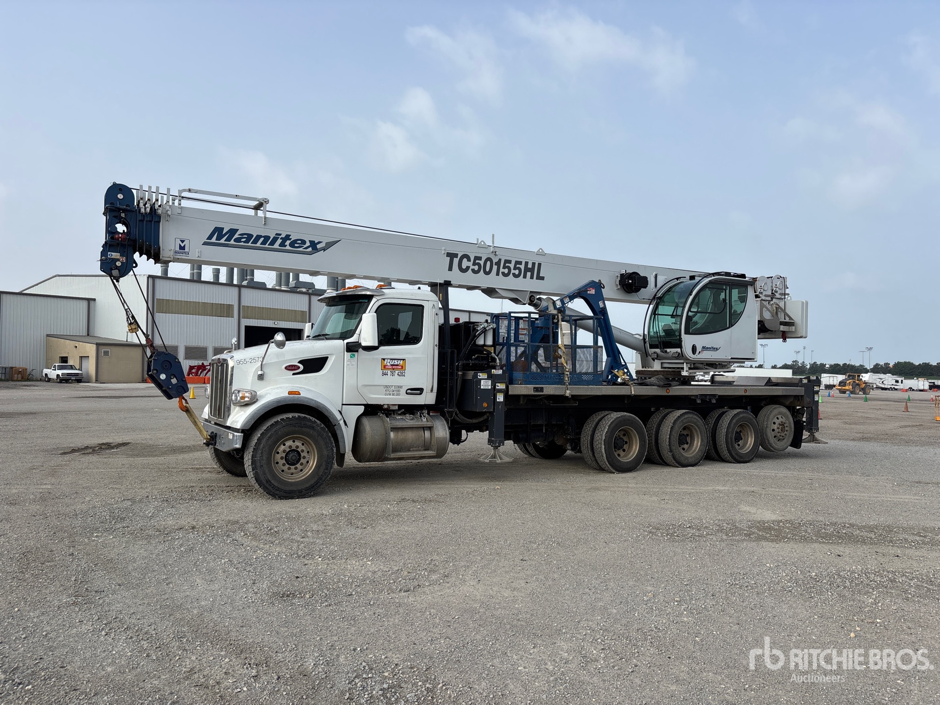 Paccar MX-13 6 Cylinder 12.9 cid Diesel 450 hp Engine, 2022 US EPA Label, Requires Diesel Exhaust Fluid, 2782 Engine hrs, Engine Brake, Eaton Fuller 8LL Manual Transmission, Double Differential Locks, 20000 lb Front Axle, 77332 lb Rears, 86000 lb GVWR, Aluminum Wheels, 425/65R22.5 Front Tires, 11R22.5 Rear Tires, Steerable Air Lift Tag Axle, Dual Steering Boxes, Double Frame, Air Trac Air Ride Suspension, 288 in Wheelbase, PTO, 38 ft - 155 ft 5 Section Boom, 327 lb Ovrehaul Ball 7 ton Capacity McKissick 354 lb 1 Sheave 15 ton Capacity Hook Block, PAT Load Moment Indicator, Out and Down Outriggers, Rear Outriggers, Cordless Remote Control, 2022 Manitex TC50155HL 100000 lb 5 Section Hydraulic Crane, 26 ft 6 in x 102 in Bed