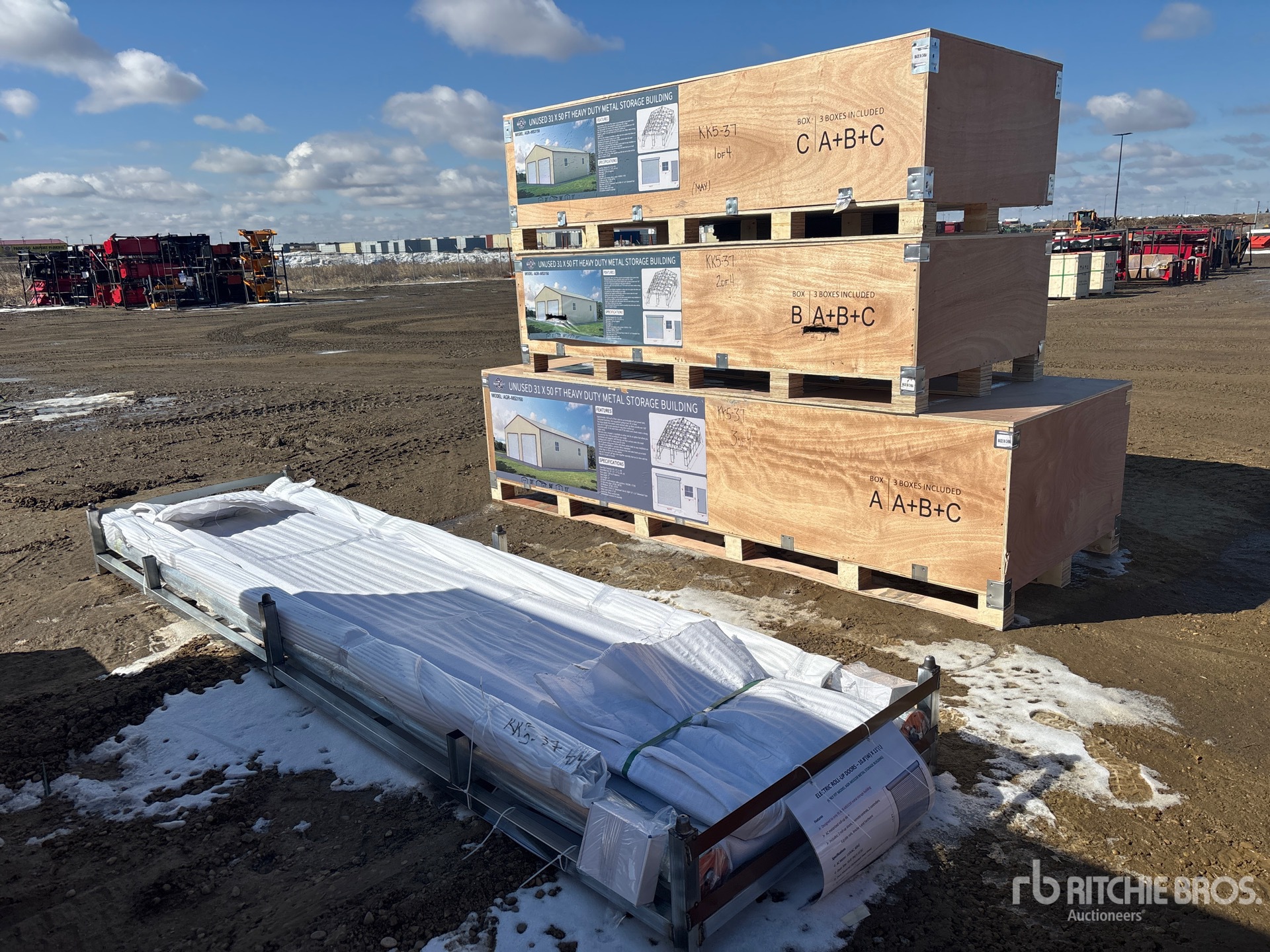 Quantity of (3) Boxes - Builds (1) Storage Building, w/ (2) Electric Roll-up Doors ; Product images displayed are stock photos. item is new/unused.
