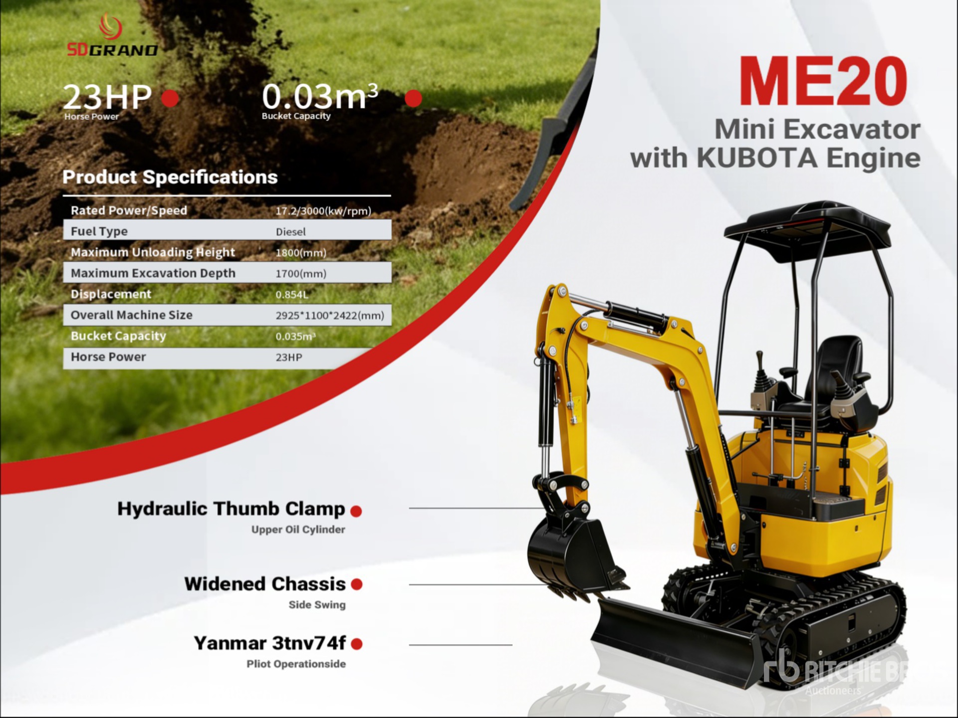 Swing Boom, Auxiliary Hydraulic Plumbing, Backfill Blade, Rubber Tracks, 0.03 m3 Digging Bucket, Hydraulic Thumb
