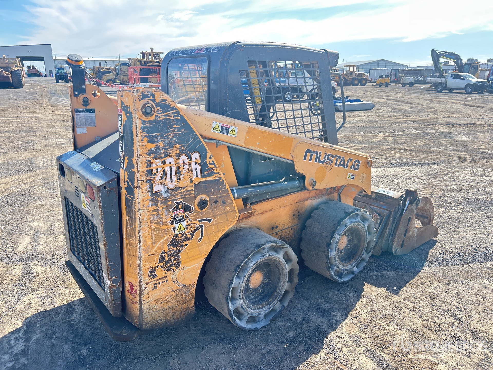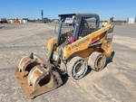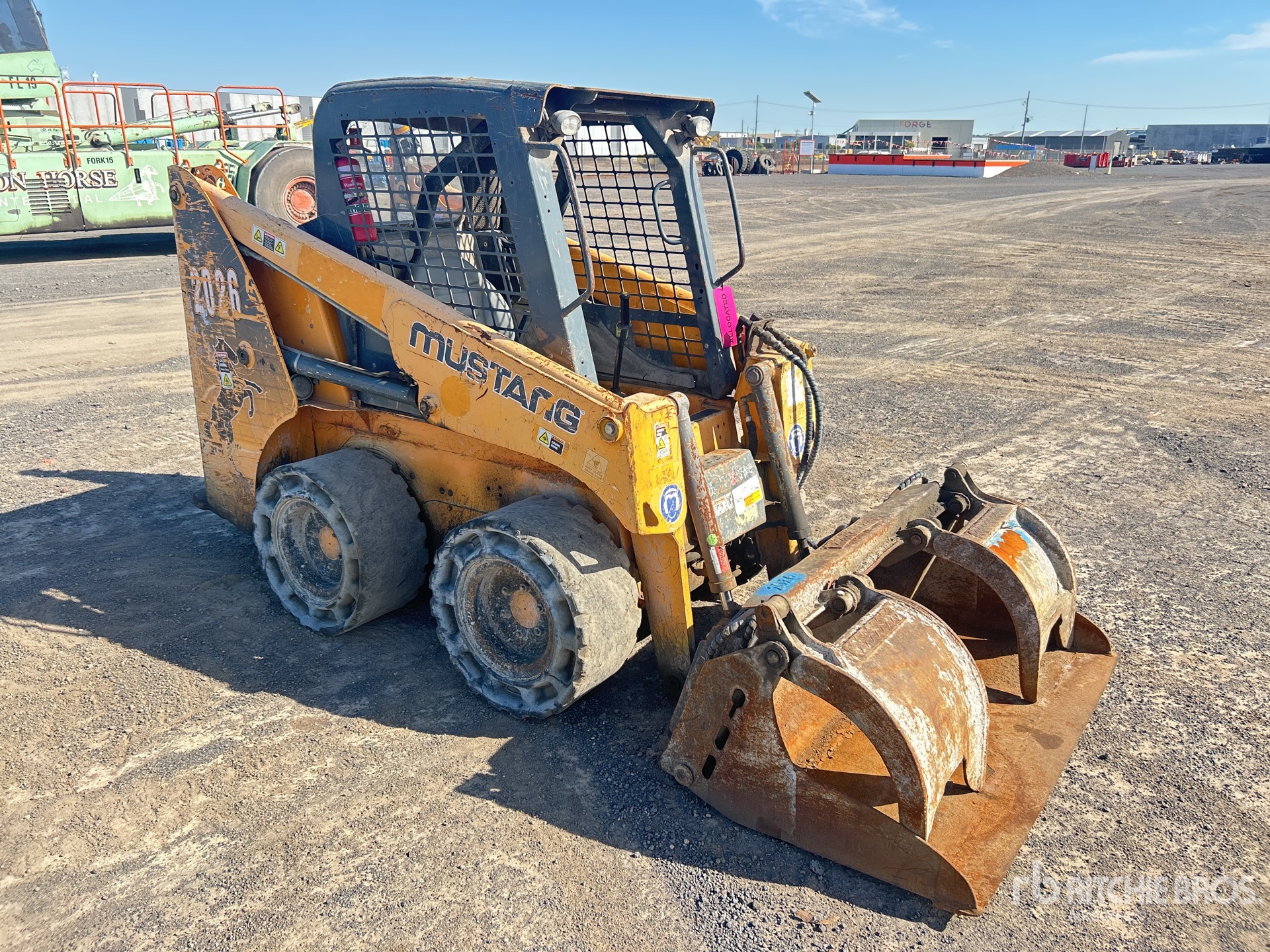 Enclosed Cab (Door missing), Joystick Steering, Non-Marking Tires, Manual Coupler, 1370 mm Grapple Bucket