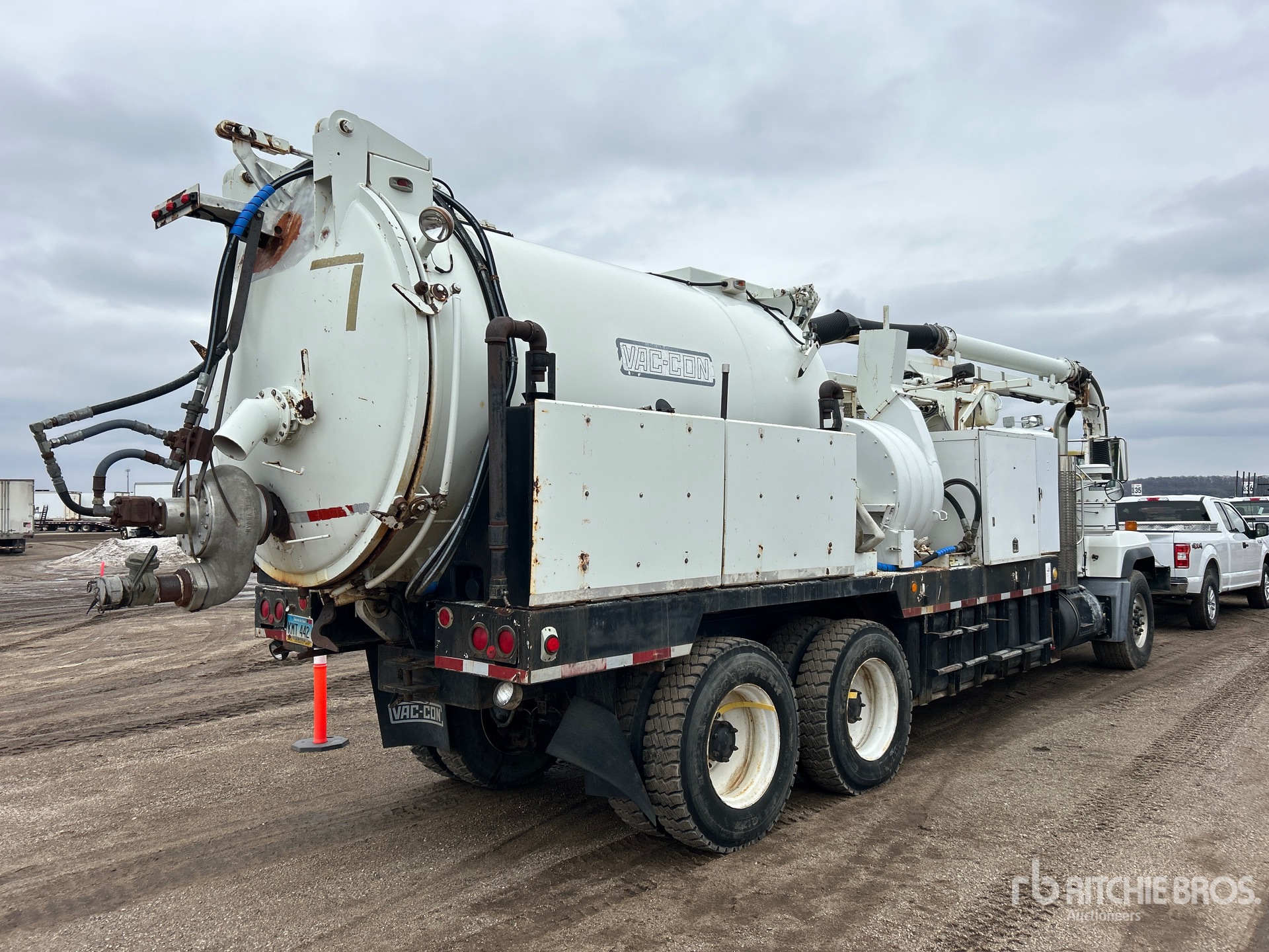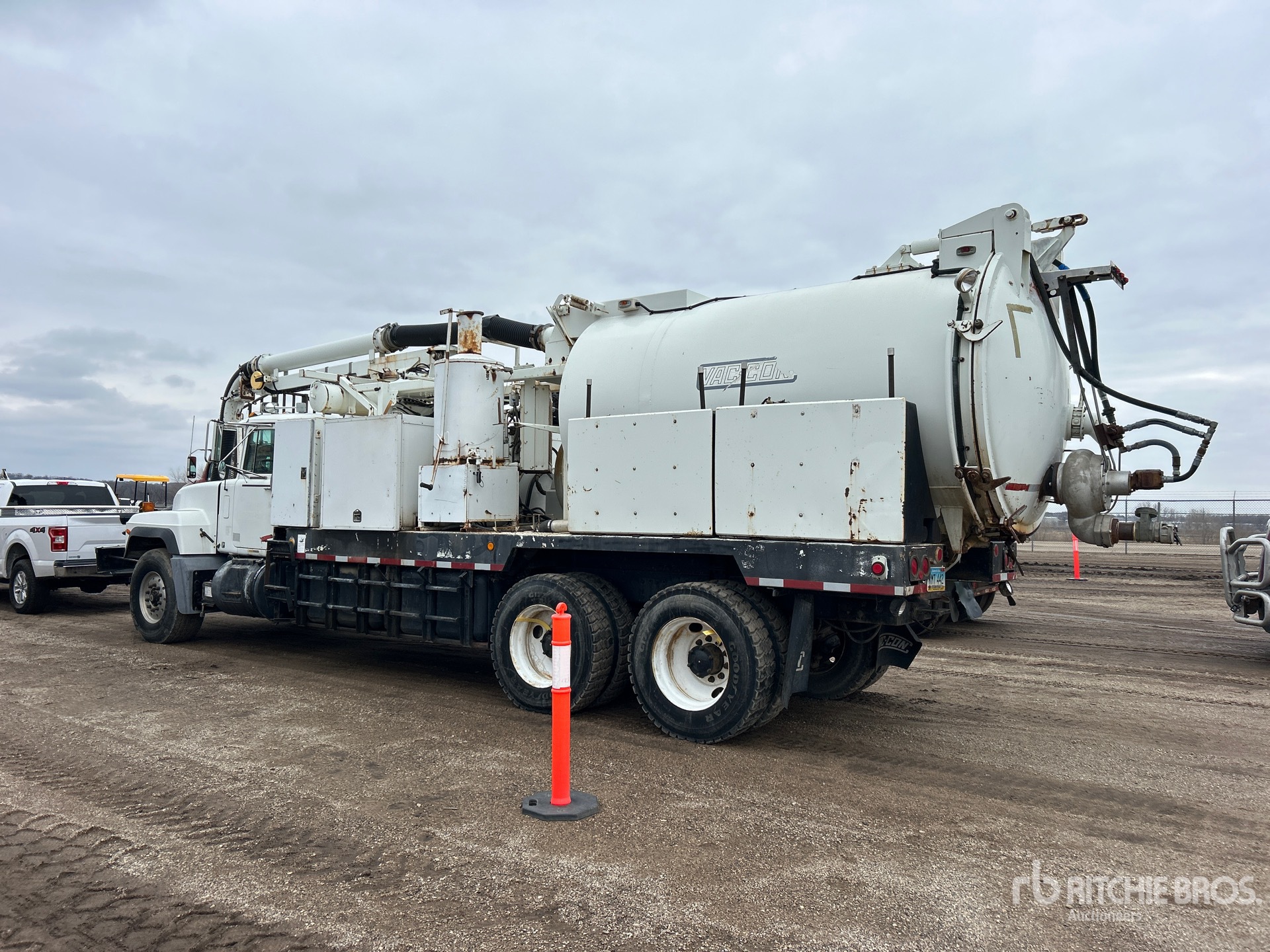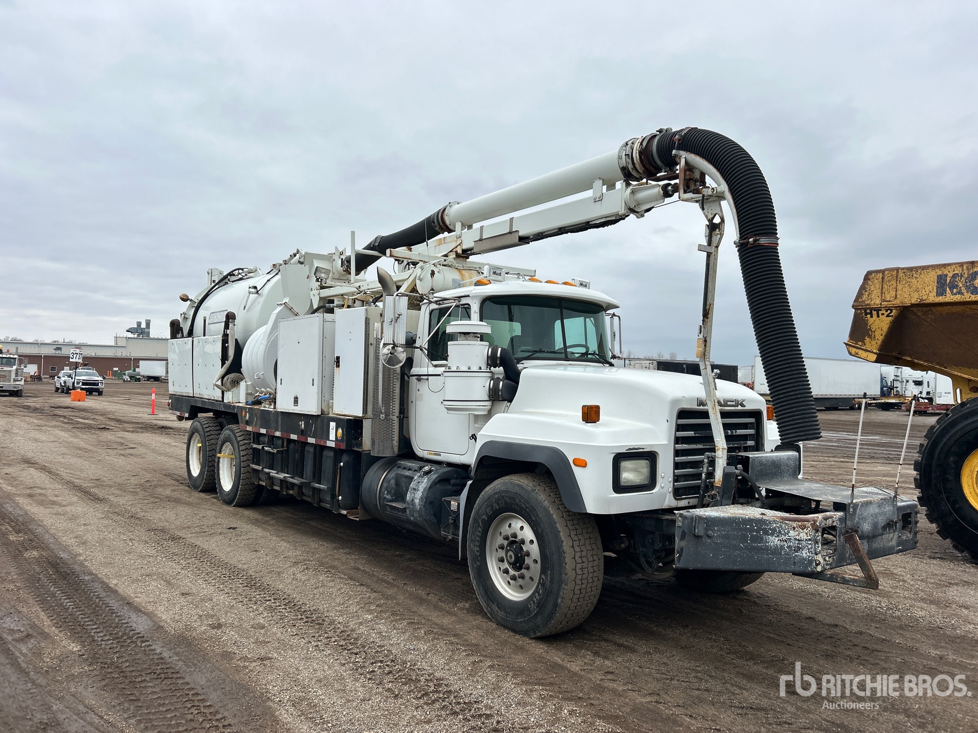 Mack E7 6 Cylinder Diesel Engine, Mack T2180 18-Speed Manual Transmission, 22927 lb Front Axle, 45854 lb Rears, 65915 lb GVWR, 425/65R22.5 Front Tires, 11R24.5 Rear Tires, Double Frame, Spring Suspension, 258 in Wheelbase, PTO, Steel Debris Tank, Front Hose Reel, Fresh Water Tank, Hydraulic Lift Tailgate, Hydraulic Tailgate Locks, 20 ft Boom, 8 in Suction Hose, PTO Driven Pump
