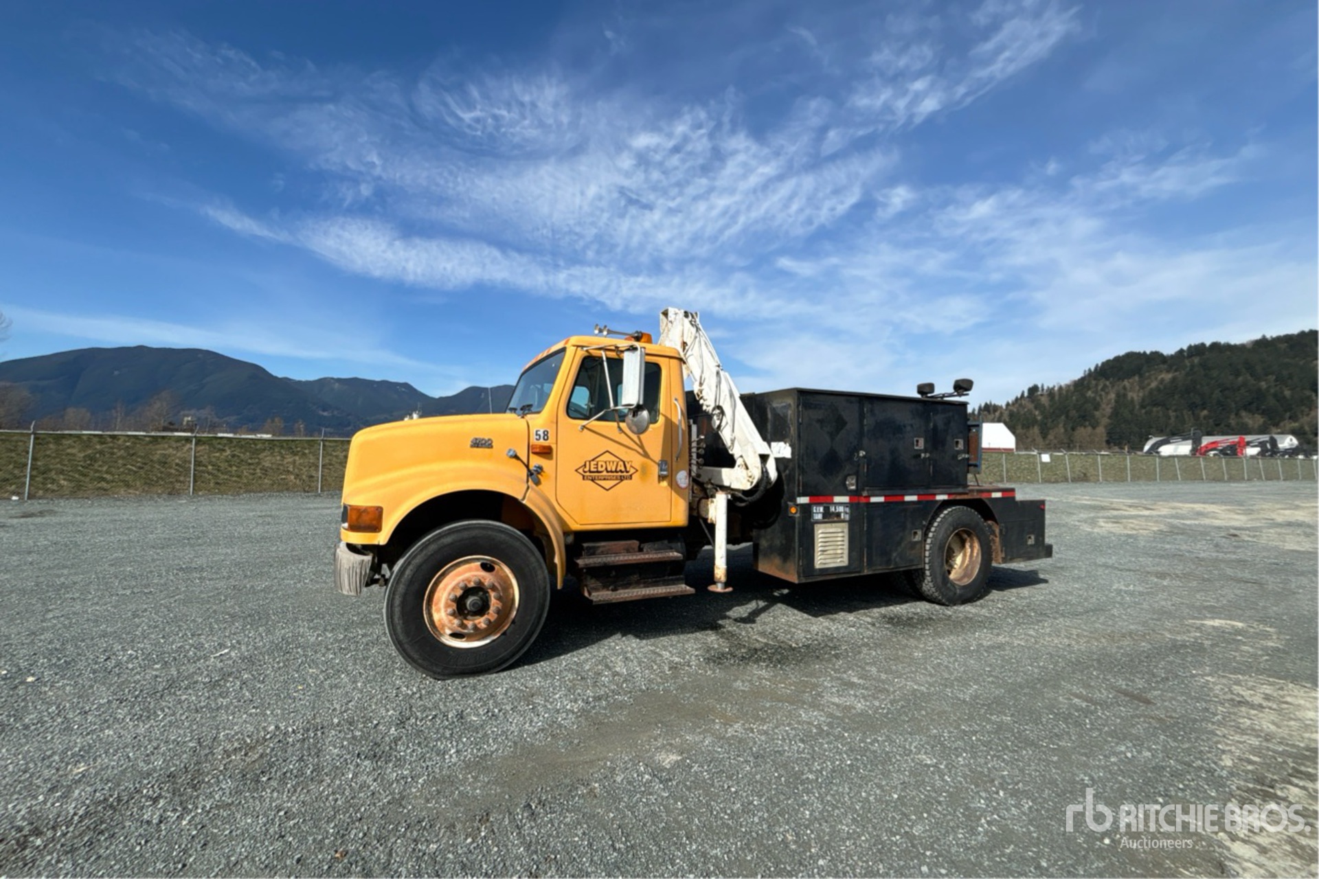 International 6 Cylinder Engine, 9919 Engine hrs, Manual Transmission, 7 -Speed Auxiliary Transmission, 5443 kg Front Axle, 9526 kg Rears, 14969 kg GVWR, 11R22.5, Spring Suspension, 192 in Wheelbase, PTO, 5 Section Boom, Straight Down Outriggers, 13 ft x 96 in Bed